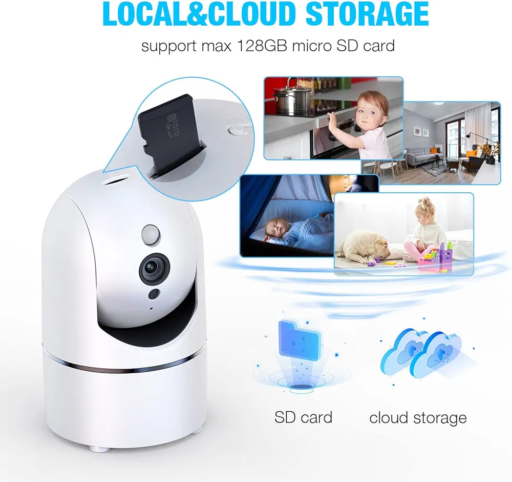NUBE SEGURA Y ALMACENAMIENTO LOCAL: el monitor para bebés admite almacenamiento y reproducción de video a través de una tarjeta SD (máx. 128 GB) o almacenamiento en la nube. Con tecnología de cifrado avanzada para proteger sus datos. La cámara del monitor para bebés proporciona acceso remoto directo desde dispositivos móviles iOS o Android y puede permitir que varias personas vean el vídeo al mismo tiempo. También puedes utilizar cámaras adicionales en diferentes habitaciones para cubrir más áreas de tu hogar