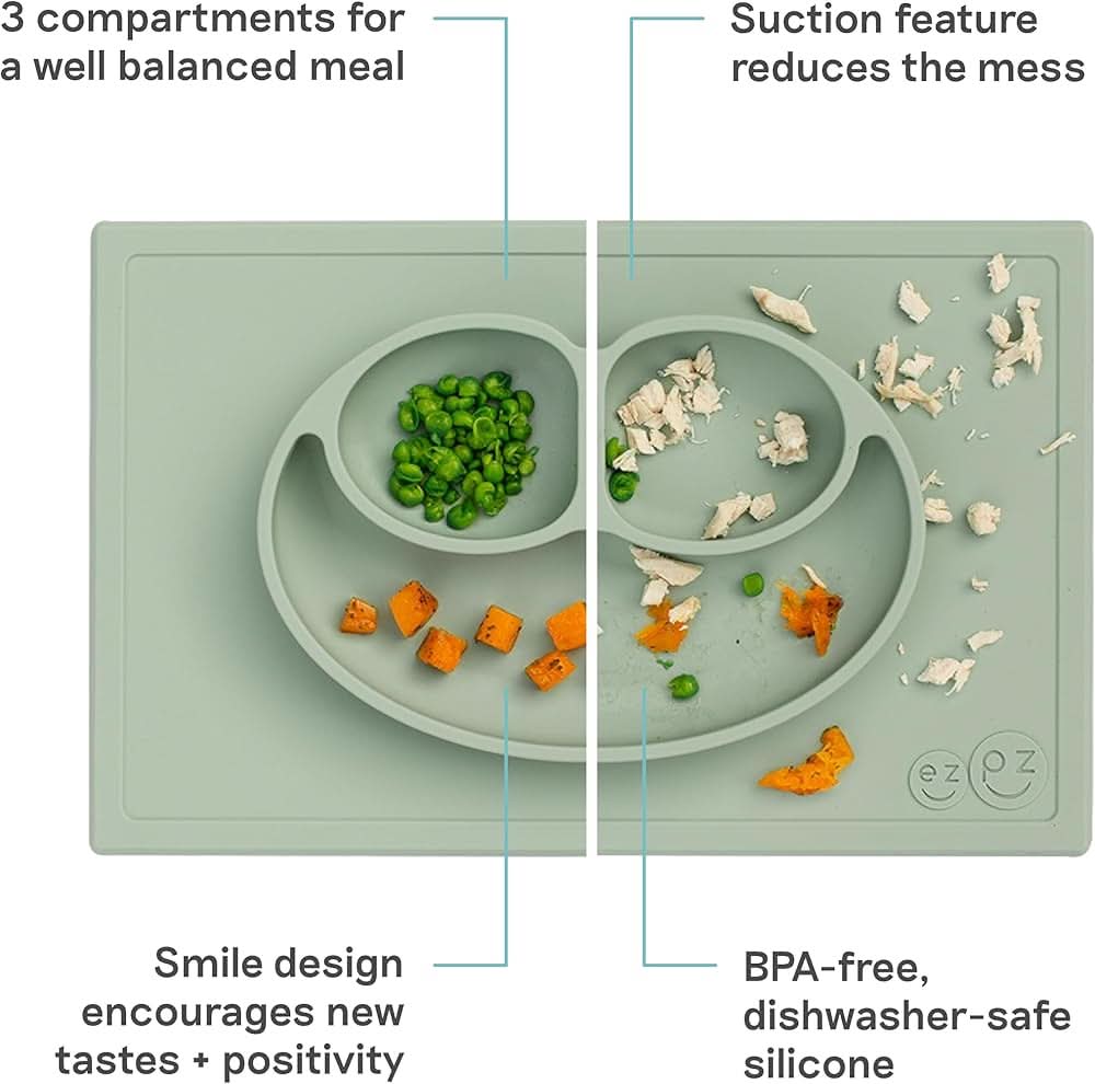 - Diseñado y probado por un experto en alimentación pediátrica: todos los productos ezpz están diseñados para ayudar a los niños a alcanzar los hitos de forma segura y eficaz. La base estable del Happy Mat promueve la autoalimentación y desarrolla habilidades motoras finas + utensilios. El diseño de la sonrisa fomenta una experiencia positiva a la hora de comer.