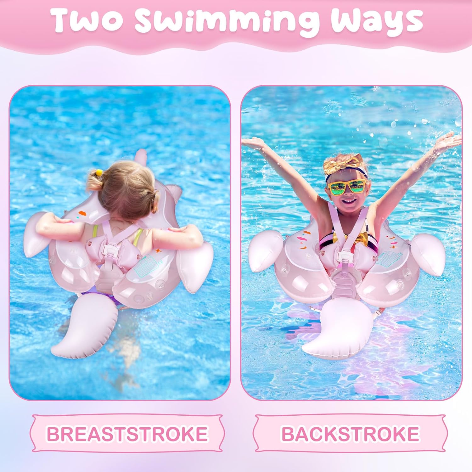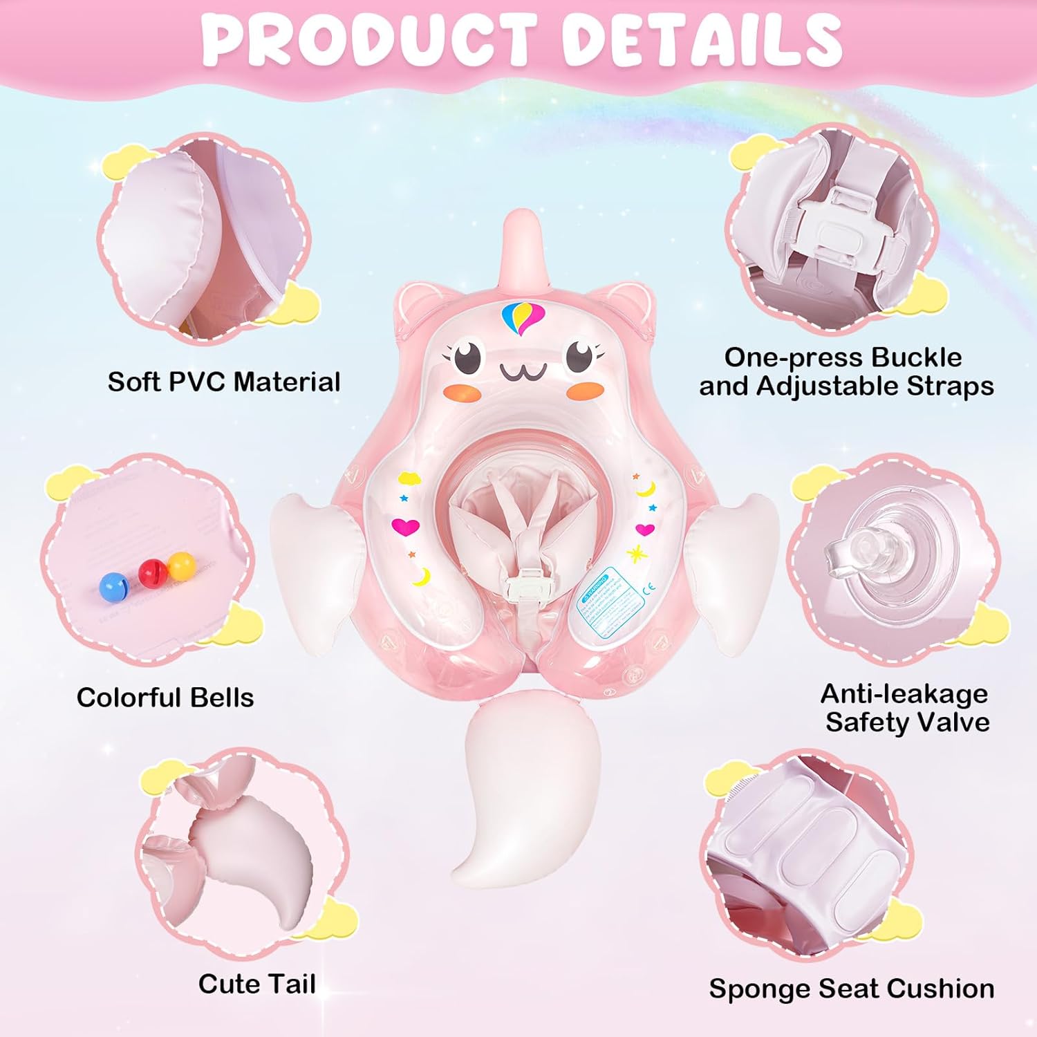 El diseño de doble válvula de seguridad evita fugas de aire y es más cómodo de usar. Correas de hombro engrosadas y soporte inferior suave para sujeción de seguridad para evitar que el bebé se deslice. Las cámaras de aire dobles alrededor del asiento proporcionan estabilidad adicional. Cola extraíble para evitar que el bebé vuelque hacia atrás. Campanas de colores incorporadas para que el bebé explore más la alegría de nadar con un sonido tan dulce.