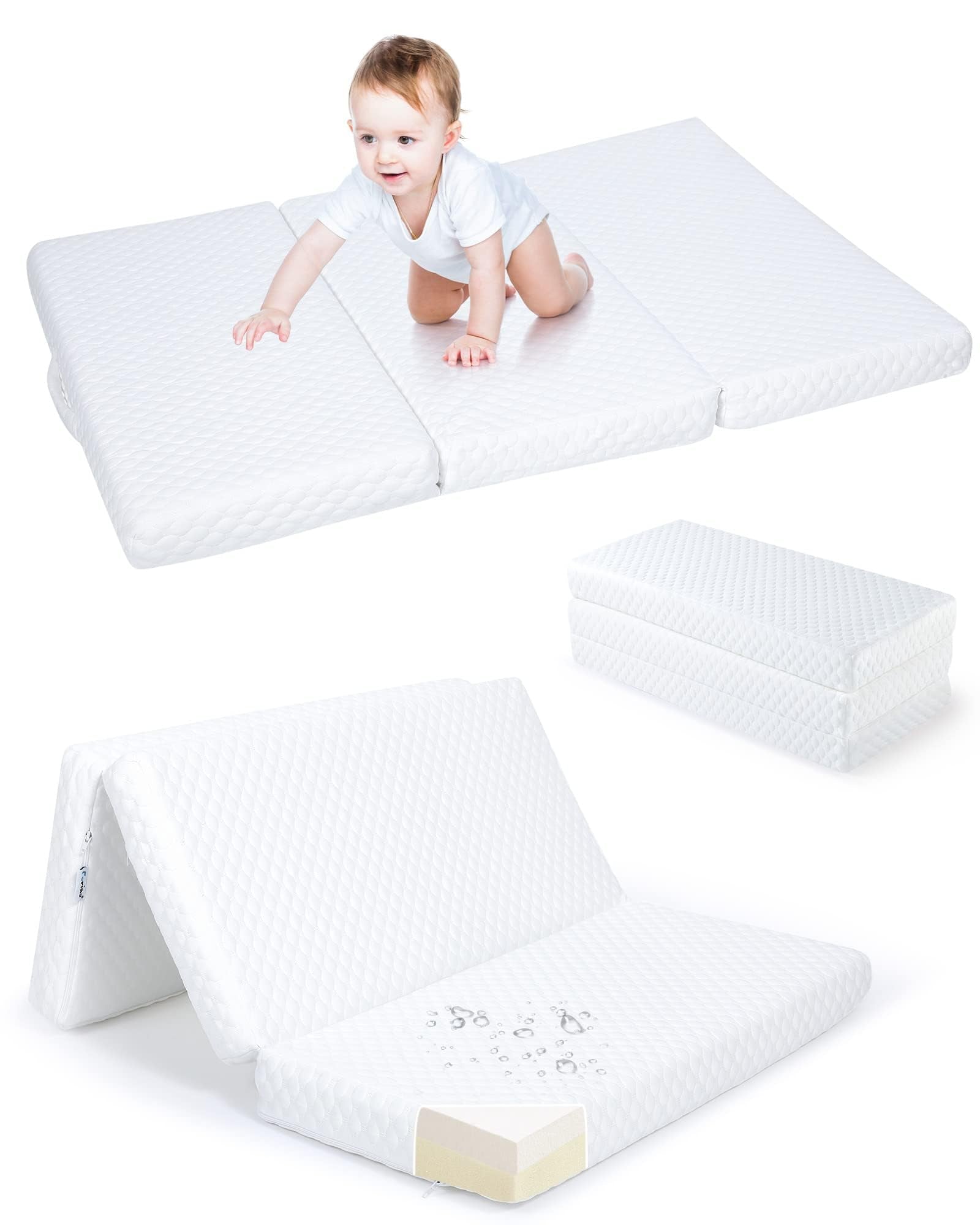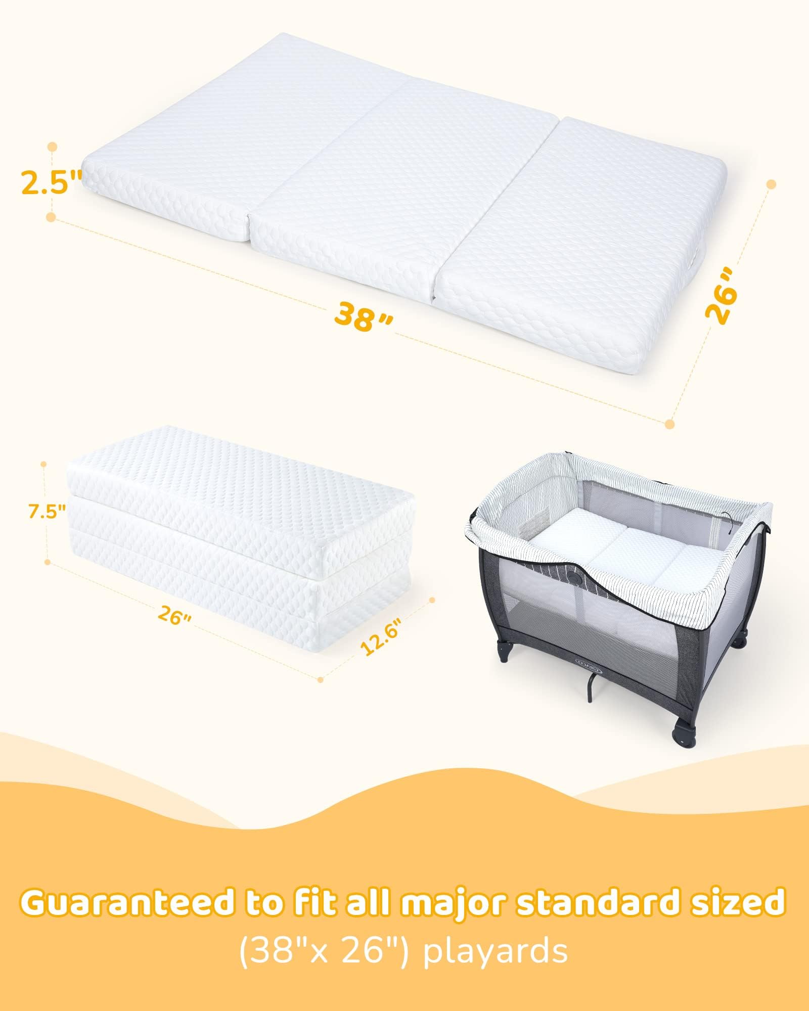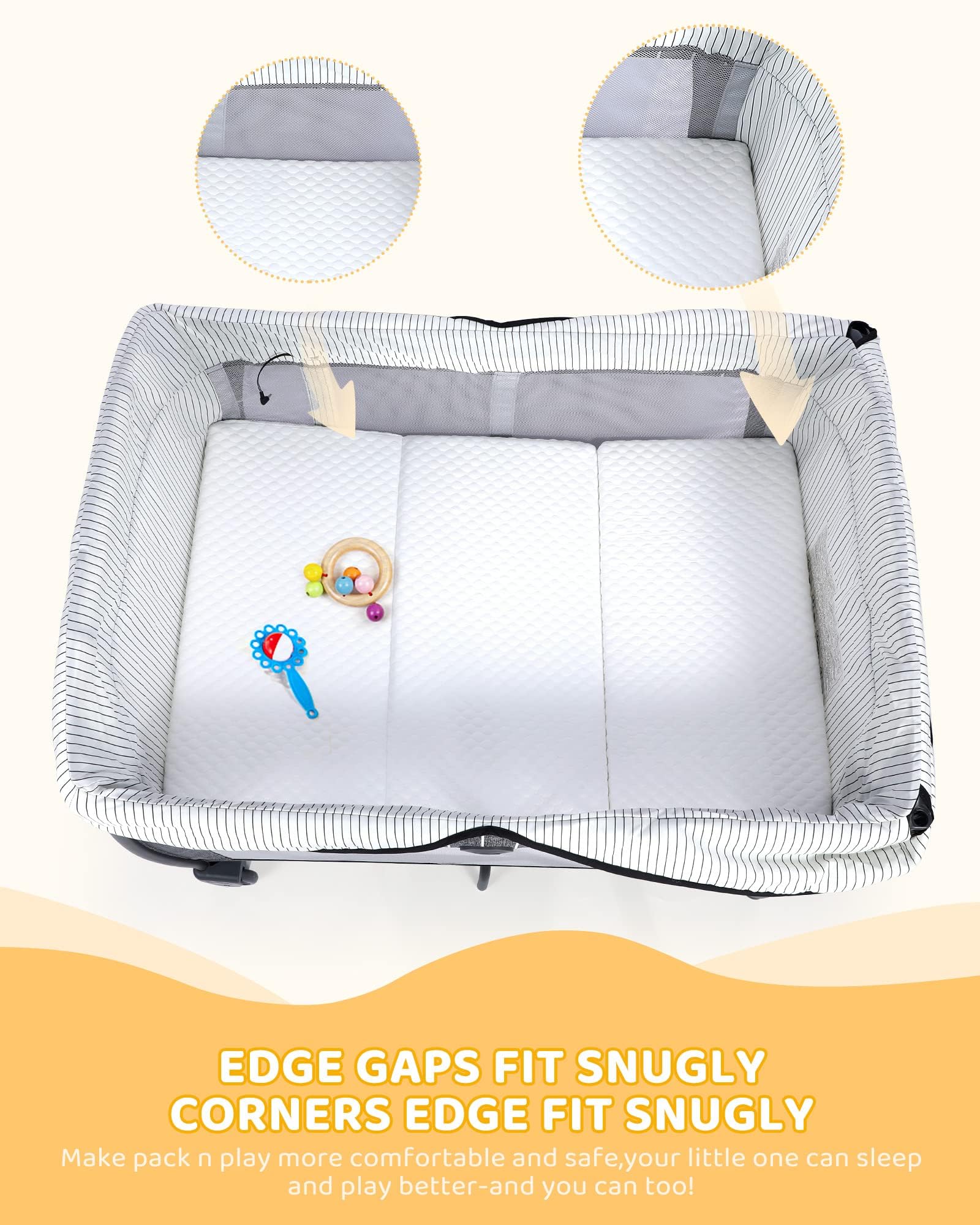 - Colchón compatible con paquete y juego: tríplex: colchón Forias Trifold Pack n Play, el diseño de triple pliegue te permite simplemente plegar el colchón para su uso, almacenamiento y viaje. Diseñado específicamente para corrales de 38 x 26 pulgadas y compatible con las principales marcas de corrales como Graco, Baby Trend, Pamo Babe, Dream on me, etc. Este colchón de juego y paquete cuenta con un soporte de borde superior, asegurando un ajuste perfecto para un entorno de juego seguro.