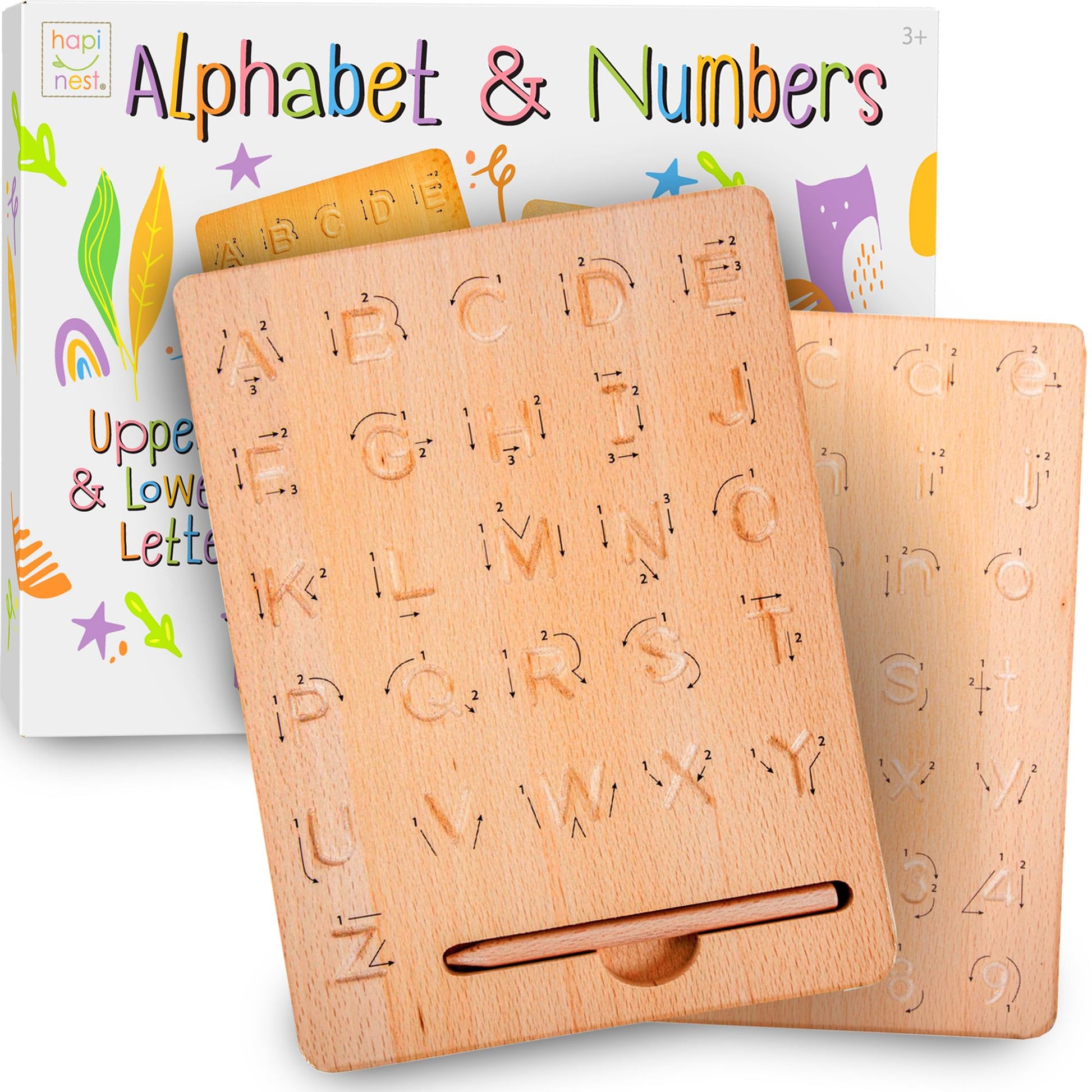 Hapinest Tabla de seguimiento de escritura a mano del alfabeto y números de madera para niños