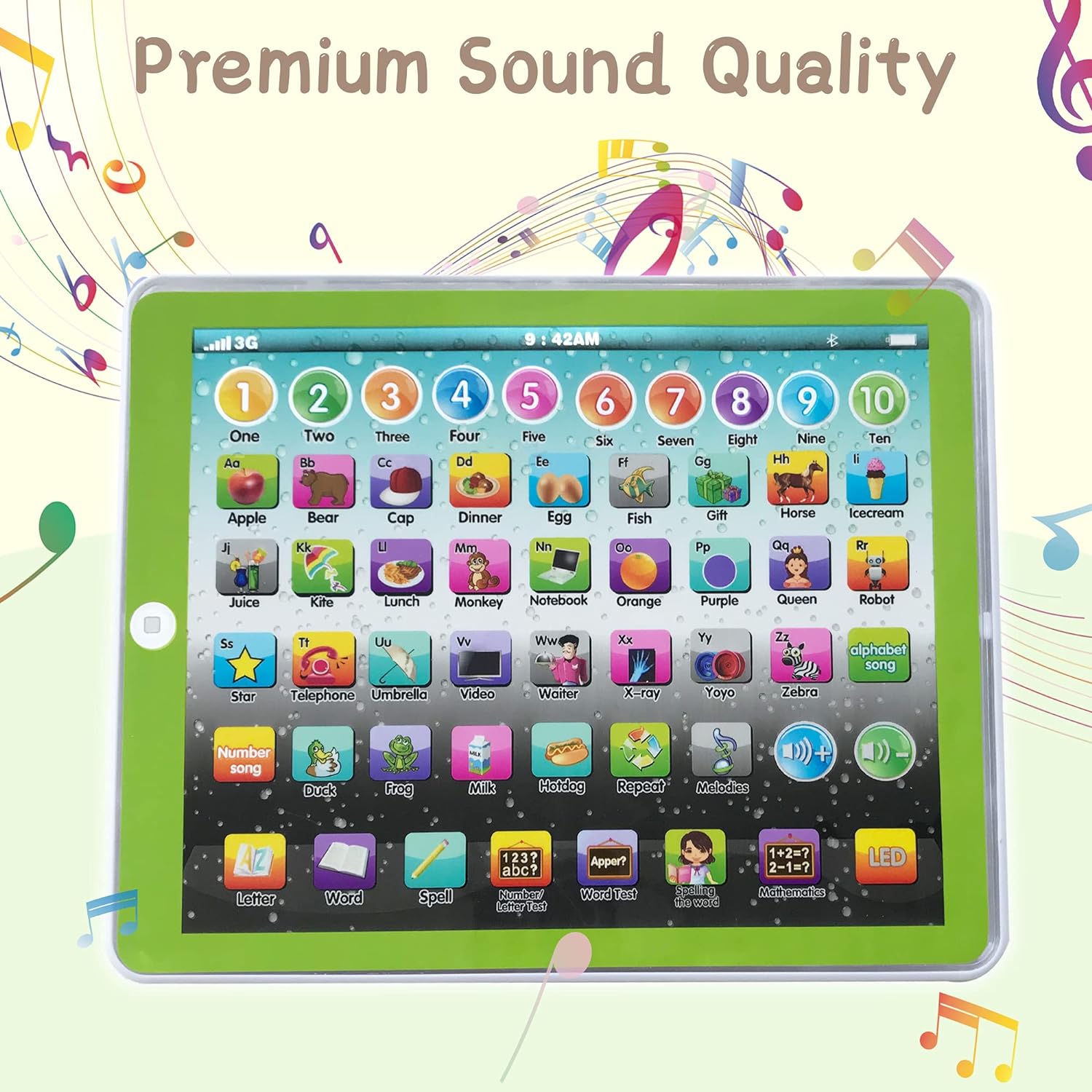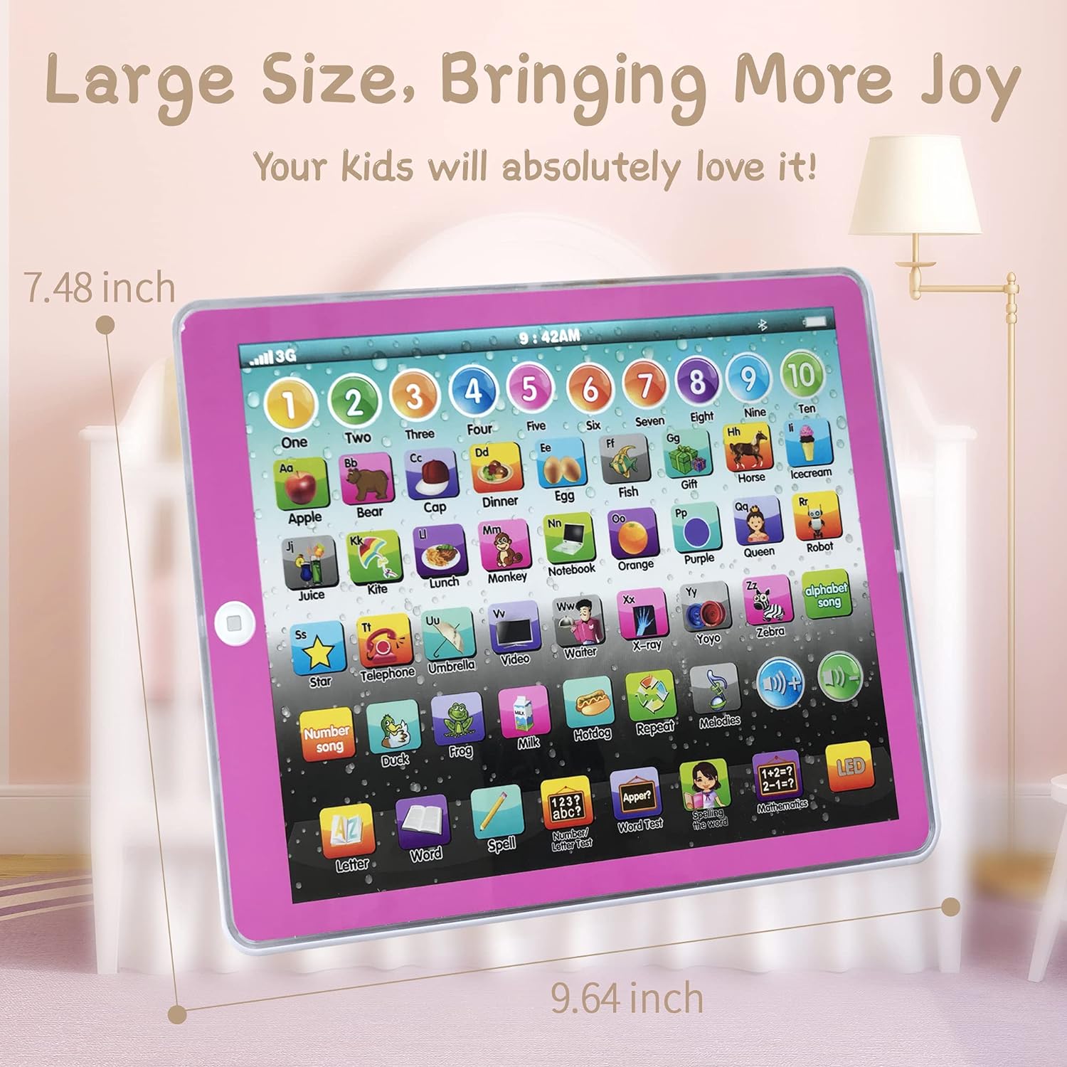 Las tabletas de juguete de aprendizaje están diseñadas para estar repletas de funciones educativas divertidas, además de números simples y lectura y escritura de 26 letras. También contiene una serie de canciones, juegos de ortografía alfanumérica, que pueden estimular el interés del niño por aprender en todos los aspectos. Este juguete educativo proporciona educación temprana. No solo permite que el niño se divierta, sino que también le permite aprender conocimientos y mejorar la capacidad cognitiva de los objetos cotidianos. Combine educación y entretenimiento en un regalo bien pensado. Especificación: Paquete incluido: 1 x tableta para bebé, 1 x manual del usuario Número de modelo: LEARN003 Material: ABS V0 Tamaño: aproximadamente 9,64 x 7,48 x 0,78 pulgadas (24,5 x 19 x 2 cm)