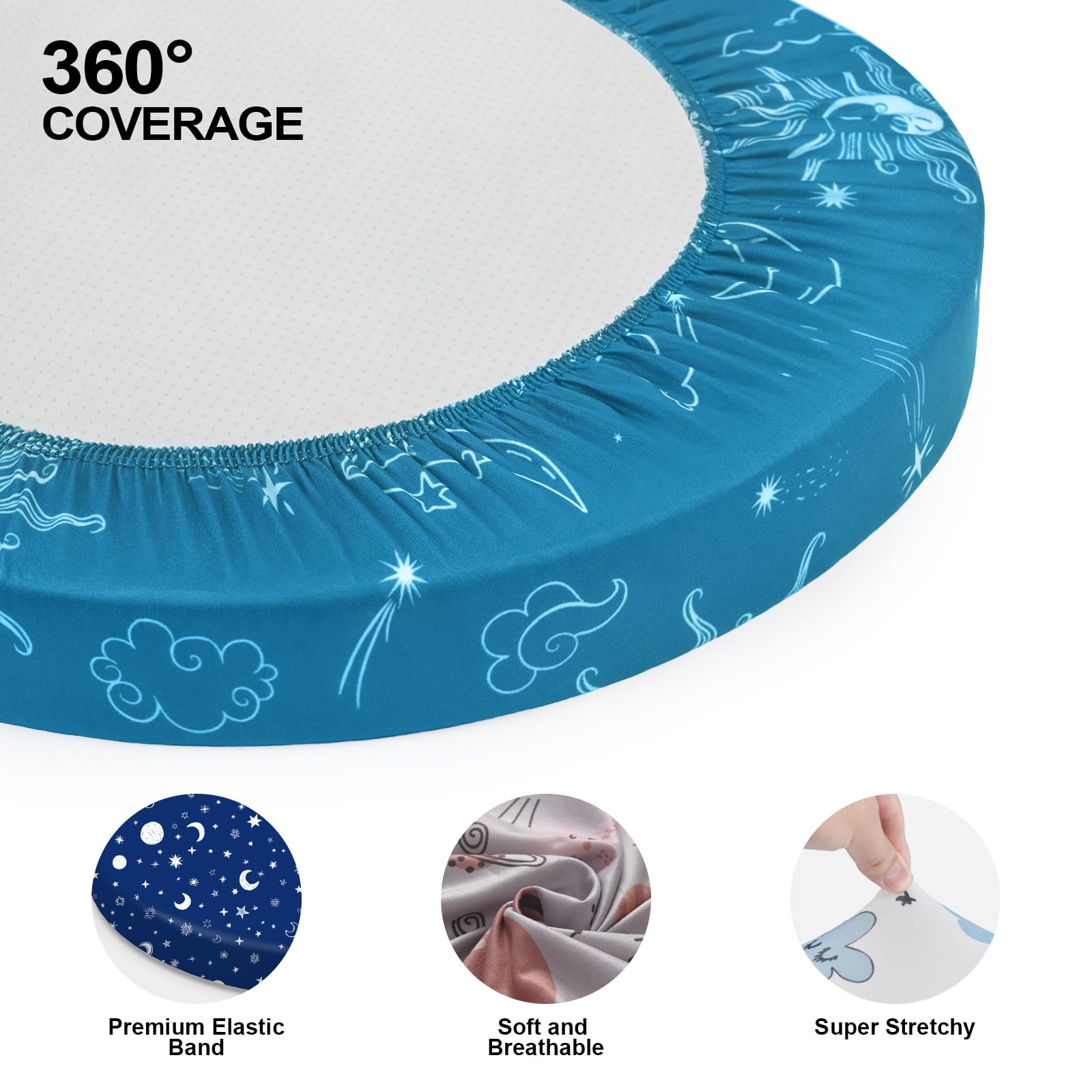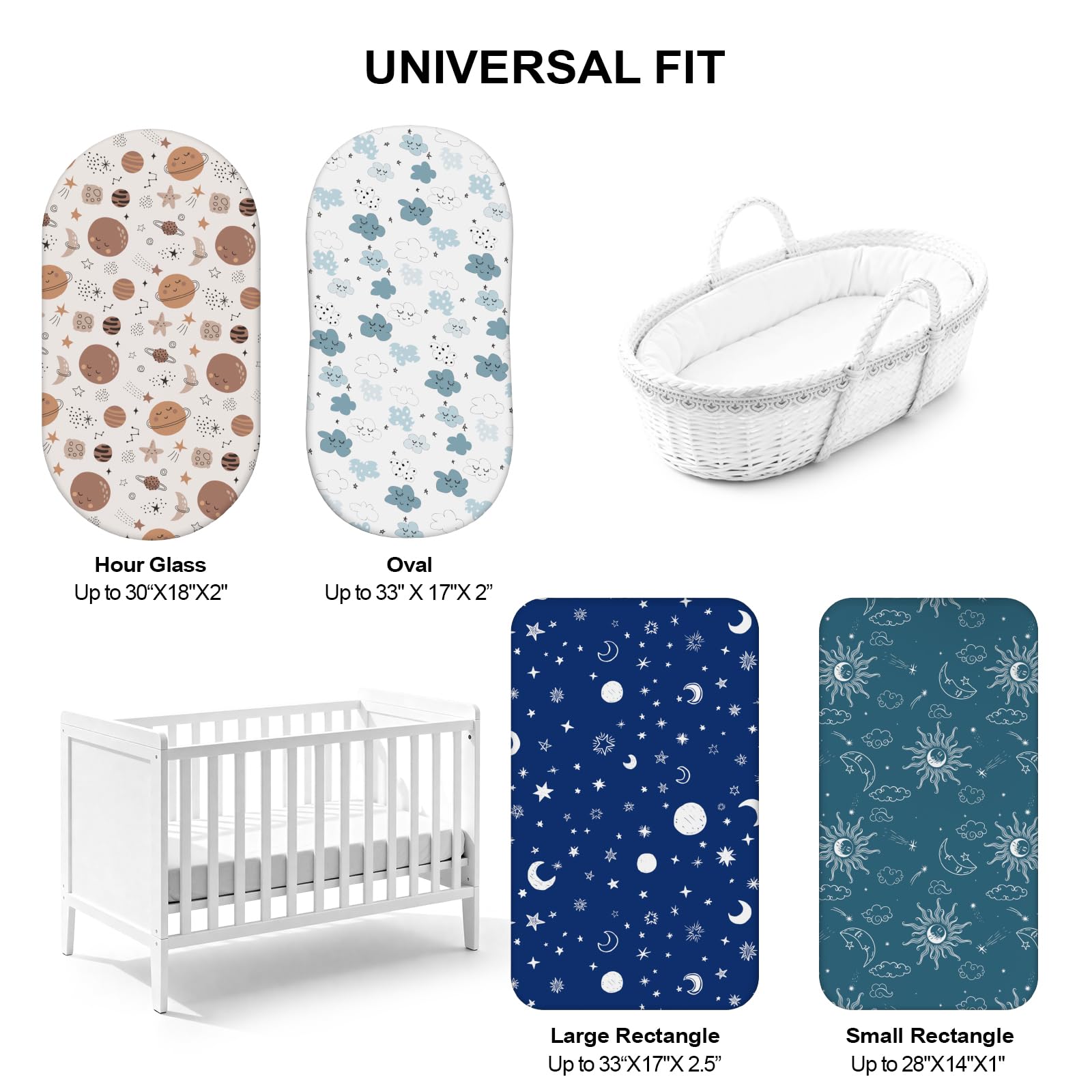 - Ajuste perfecto: la relajante sábana bajera ajustable para moisés mide 32 x 16 pulgadas y tiene un grosor de hasta 4 pulgadas, por lo que es compatible con una amplia gama de marcas de colchones. Es compatible con formas de cuna de reloj de arena, ovaladas, rectangulares y redondas, proporcionando una protección completa para tu bebé.