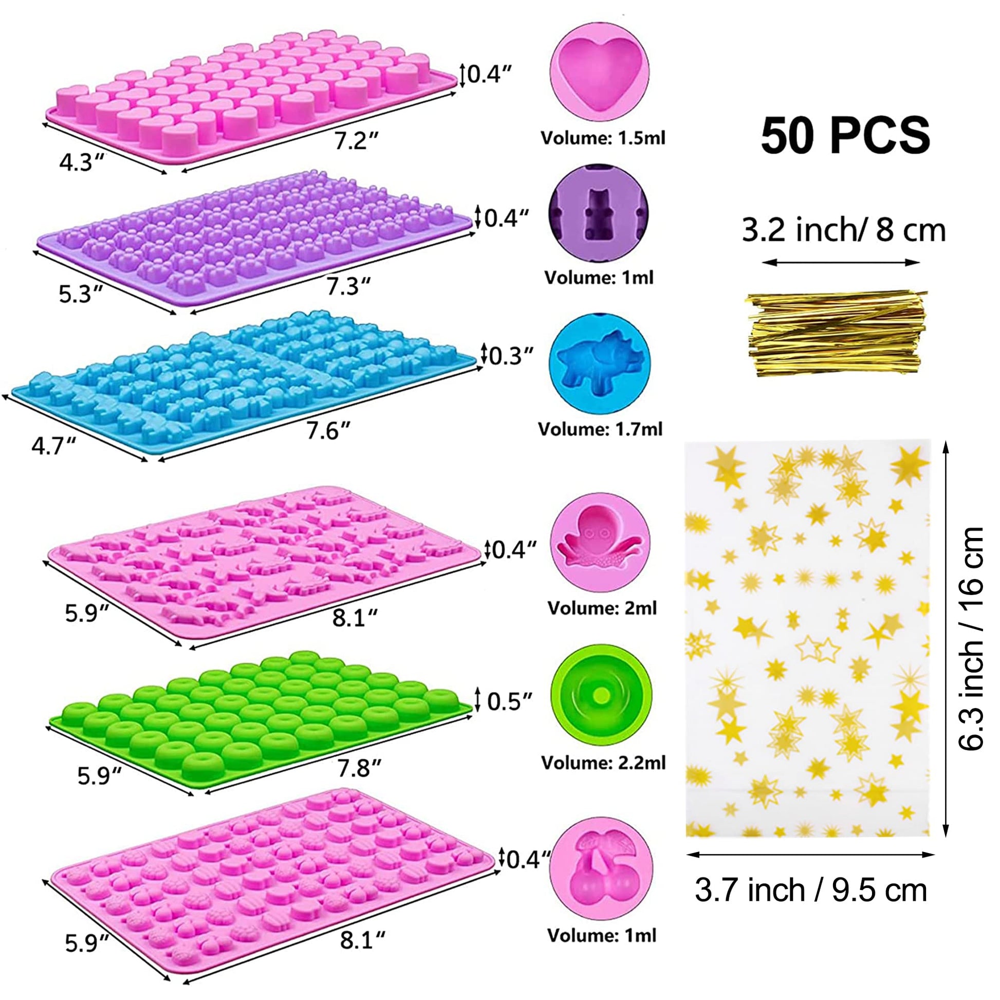 Juego de 6 moldes de gomitas, 299 caramelos, 16 formas con 4 goteros, 1 cepillo limpio y 50 bolsas de paquete