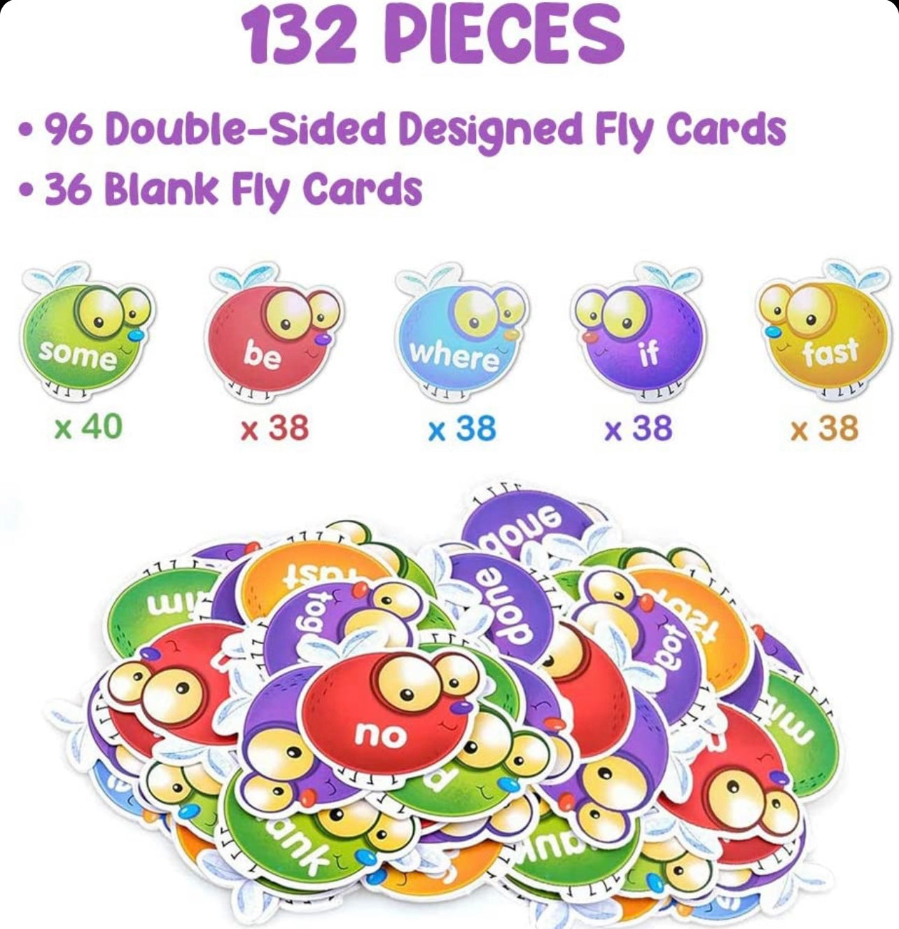 El juego de juguetes educativo definitivo con juego de lectura para niños con palabras visuales incluye 96 Fly Cards de diseño de doble cara (192 palabras Dolch), 36 tarjetas fly en blanco, 1 bolsa de transporte y 4 matamoscas. A diferencia de otros juegos de bofetadas de palabras a la vista que no ajustan las tablas de palabras, nuestro juego de palabras a la vista incluye 5 hojas diferentes ajustadas por edad para que pueda jugar un divertido juego de alfabetización de acuerdo con la edad de su hijo. Permítales disfrutar de un juego de swat de palabras vistas que está especialmente diseñado con colores y materiales ecológicos que son completamente seguros para el uso diario. Toneladas de palabras reconocibles a la vista de matamoscas con ilustraciones y un juego atractivo seguramente entretendrán a tus angelitos.