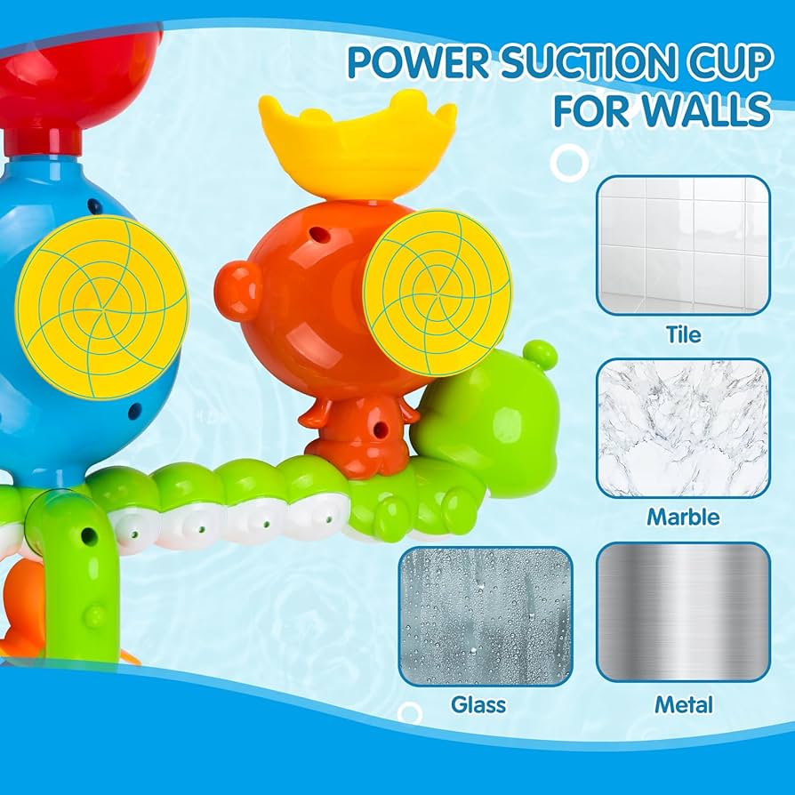 VENTOSAS DE ALTA RESISTENCIA: Este juguete para la bañera cuenta con dos ventosas de alta resistencia en la parte posterior. Simplemente colócalas en la bañera o en una pared lisa del baño. Puedes cambiarlo de lugar y volver a colocarlo cuando quieras. Consejo: La succión es aún mejor después de mojarlo. Asegúrate de que la bañera esté lisa y limpia. ?SIN PILAS Y CON BORDES SUAVES: Este juguete para niños pequeños está fabricado con plástico resistente y libre de BPA. Sus bordes son suaves y ligeros. No requiere pilas.