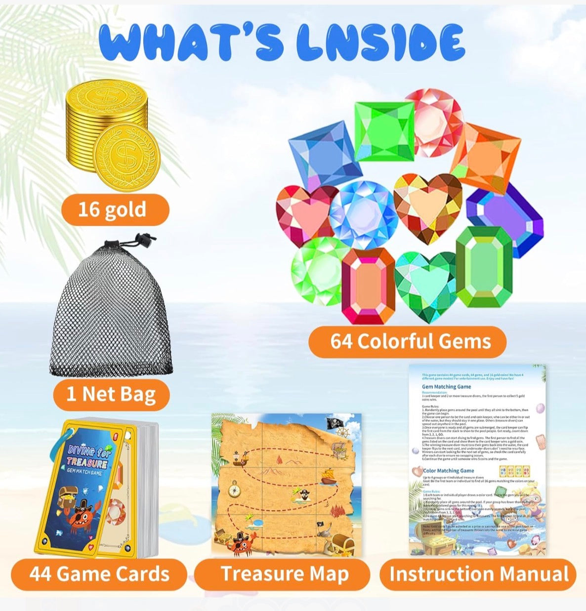 5 JUGUETES DE BUCEO Y JUEGOS DE ENCONTRAR EN UN SOLO SET: Vive la aventura submarina definitiva con nuestro versátil set de juego, que incluye juegos de unir formas, combinar colores, unir gemas y tres en raya, todo en un único y emocionante paquete. Las imágenes del producto incluyen descripciones detalladas de cómo jugar con los juguetes de buceo. TODAS LAS TARJETAS Y HOJAS DE INSTRUCCIONES SON IMPERMEABLES: Disfruta de un juego sin preocupaciones bajo las olas, ya que todas las tarjetas y hojas de instrucciones son impermeables, lo que garantiza durabilidad y claridad incluso en el entorno acuático. FÁCIL DE TRANSPORTAR CON BOLSA DE MALLA: Lleva la diversión a donde vayas con nuestra bolsa de malla incluida, que facilita el transporte y la organización de todos los componentes para tus juguetes de buceo. 64 GEMAS, 44 CARTAS DE JUEGO, 1 TABLERO DE TRES EN CADA TIEMPO: Sumérgete en la variedad que ofrece nuestro set de juego, que incluye 64 gemas, 44 cartas de juego y 1 tablero de tres en raya: todo lo que necesitas para disfrutar durante horas de entretenimiento cautivador Diving Pool Toys.