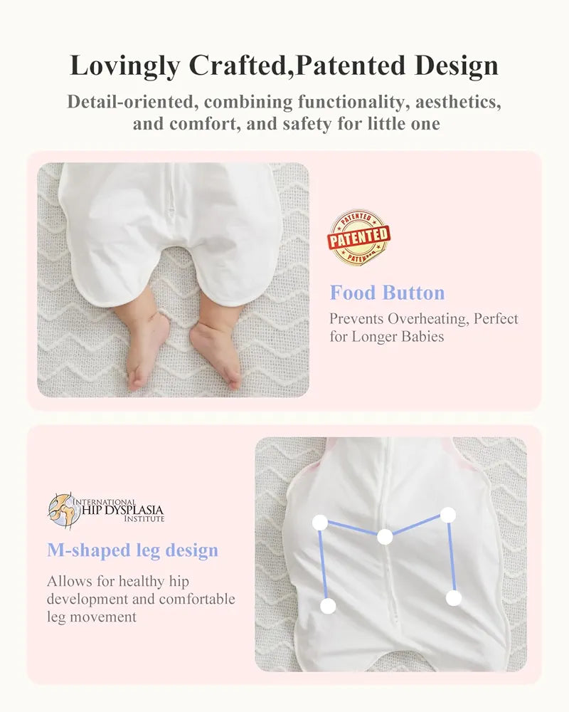 Dobladillo ampliado para un desarrollo saludable de la cadera: especialmente diseñado con un dobladillo ensanchado para adaptarse a la posición de la pierna en forma de M de un bebé. La manta para bebé de 3 a 6 meses proporciona un amplio espacio para que sus caderas y piernas se muevan libremente. Esto promueve el desarrollo natural de la articulación de la cadera y fomenta una posición científicamente correcta para dormir. Deshazte de las arriesgadas mantas sueltas, nuestra manta única de "brazos arriba" garantiza un ambiente de sueño seguro, cómodo y seguro.