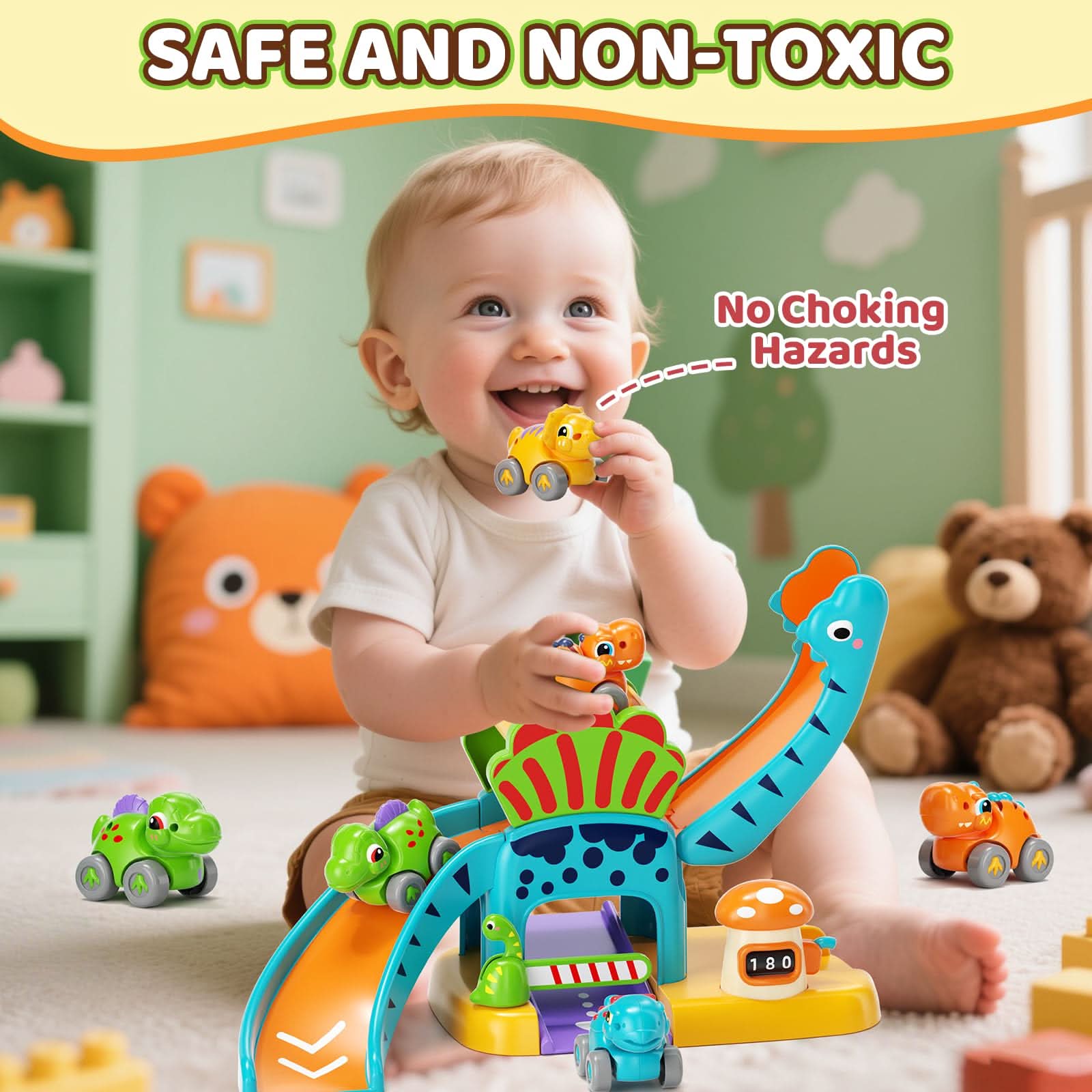 Lehoo Castle Juguetes para niños de 1 año, tobogán de dinosaurio con 4 mini autos de empuje