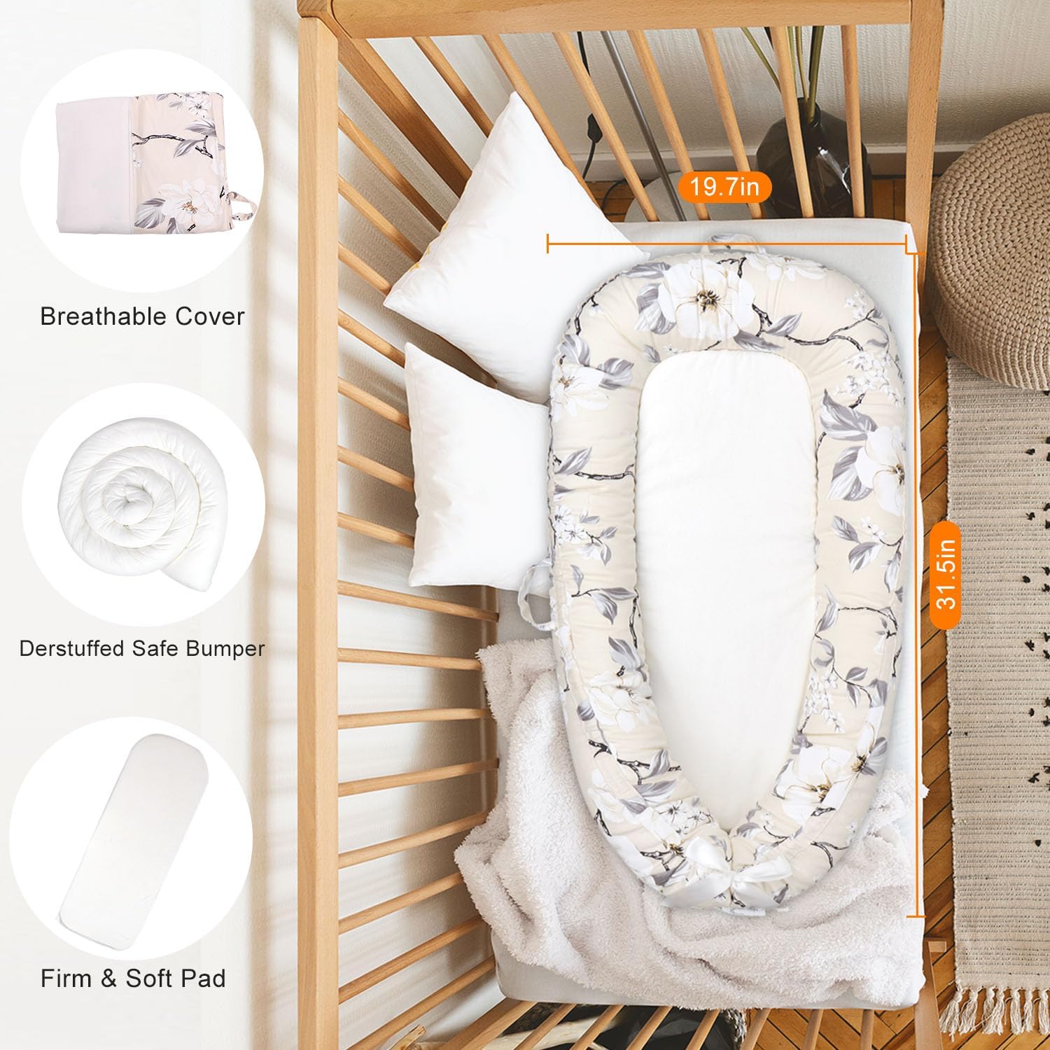 【Funda lavable a máquina mejorada】- Hay dos fuertes cremalleras ocultas en la parte inferior de la almohada para tumbona de bebé, que se pueden usar para desmontar la funda de la almohadilla y la cerca para facilitar el lavado. Tenga en cuenta: debido a que el tubo es de tela por dentro, no se recomienda lavarlo.