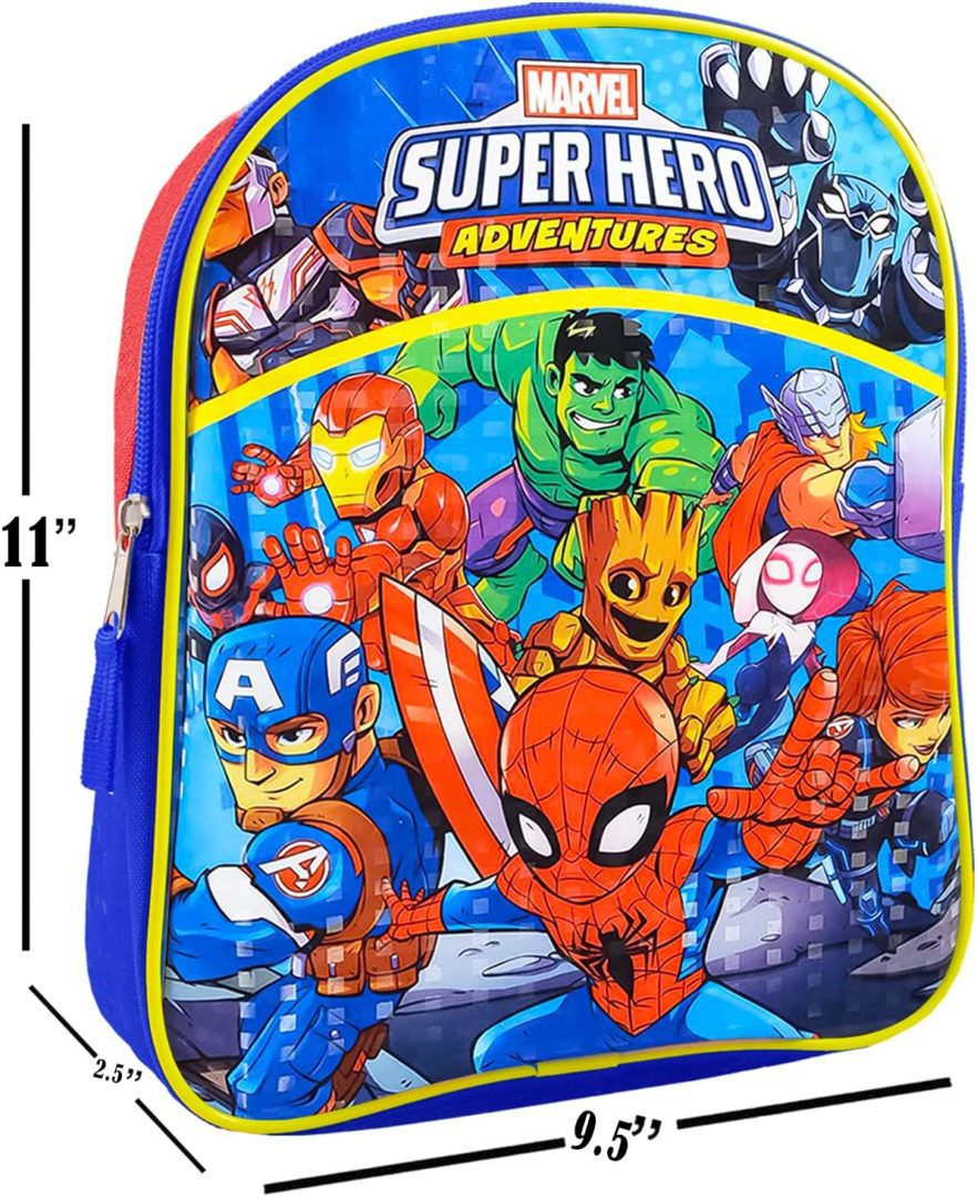Esta mini mochila Marvel Super Hero Adventures mide aproximadamente 11 pulgadas de alto y viene con correas de hombro trenzadas ajustables, bucle superior para colgar y emocionante arte de cubierta de superhéroes de los Vengadores