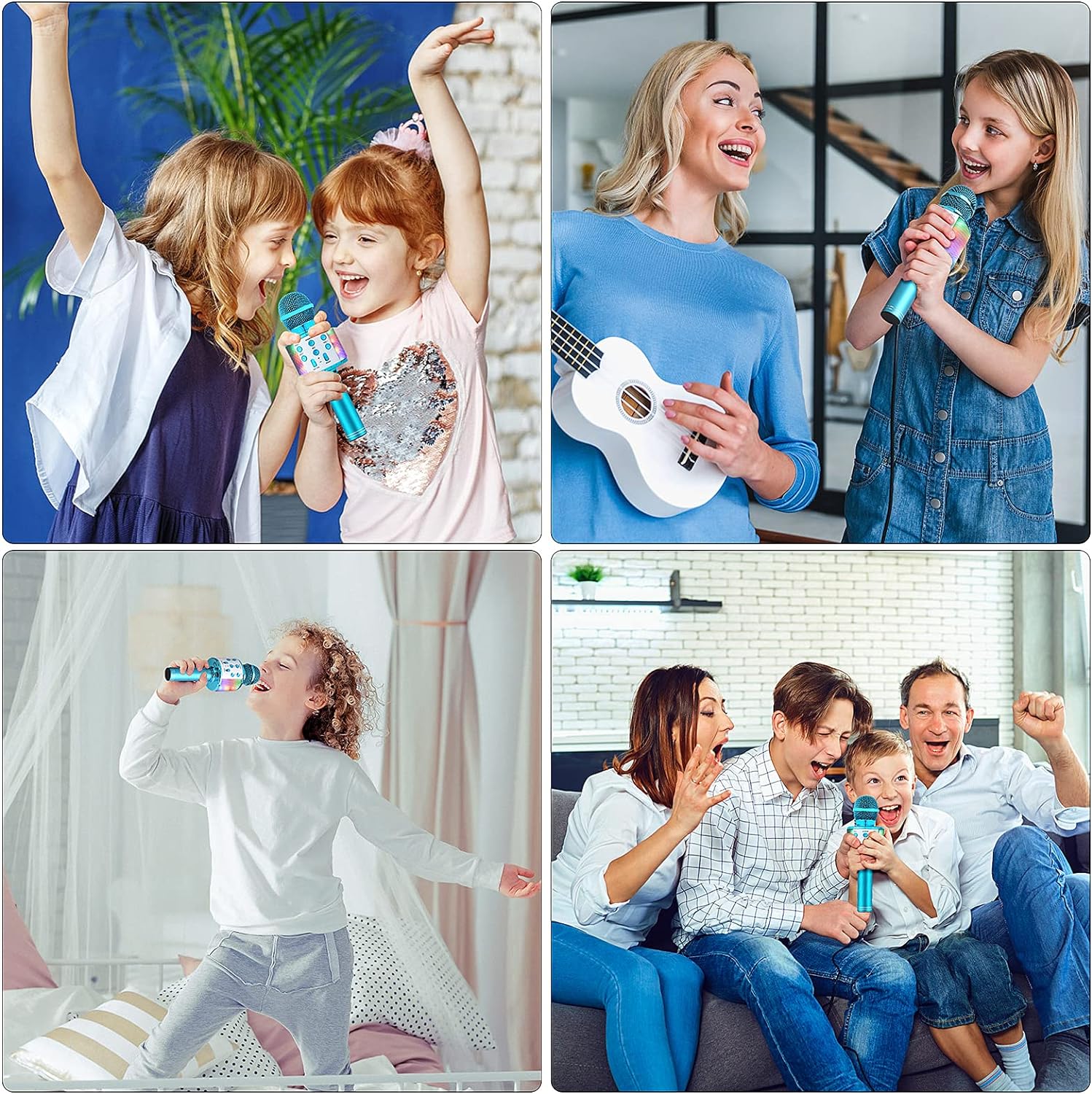 Micrófono inalámbrico 5 en 1: micrófonos de karaoke, conexión Bluetooth inalámbrica, canto karaoke en cualquier lugar en cualquier momento; micrófono eco. Este micrófono inalámbrico es un altavoz portátil si solo quieres disfrutar de la música; altavoz: un botón para encender, tu voz se puede amplificar sin conectar el micrófono a nada. Grabadora: graba el crecimiento de tu hijo y el tiempo de canto feliz contigo. Modelo de radio. Es lo suficientemente fuerte, la función de radio se puede activar en cualquier momento