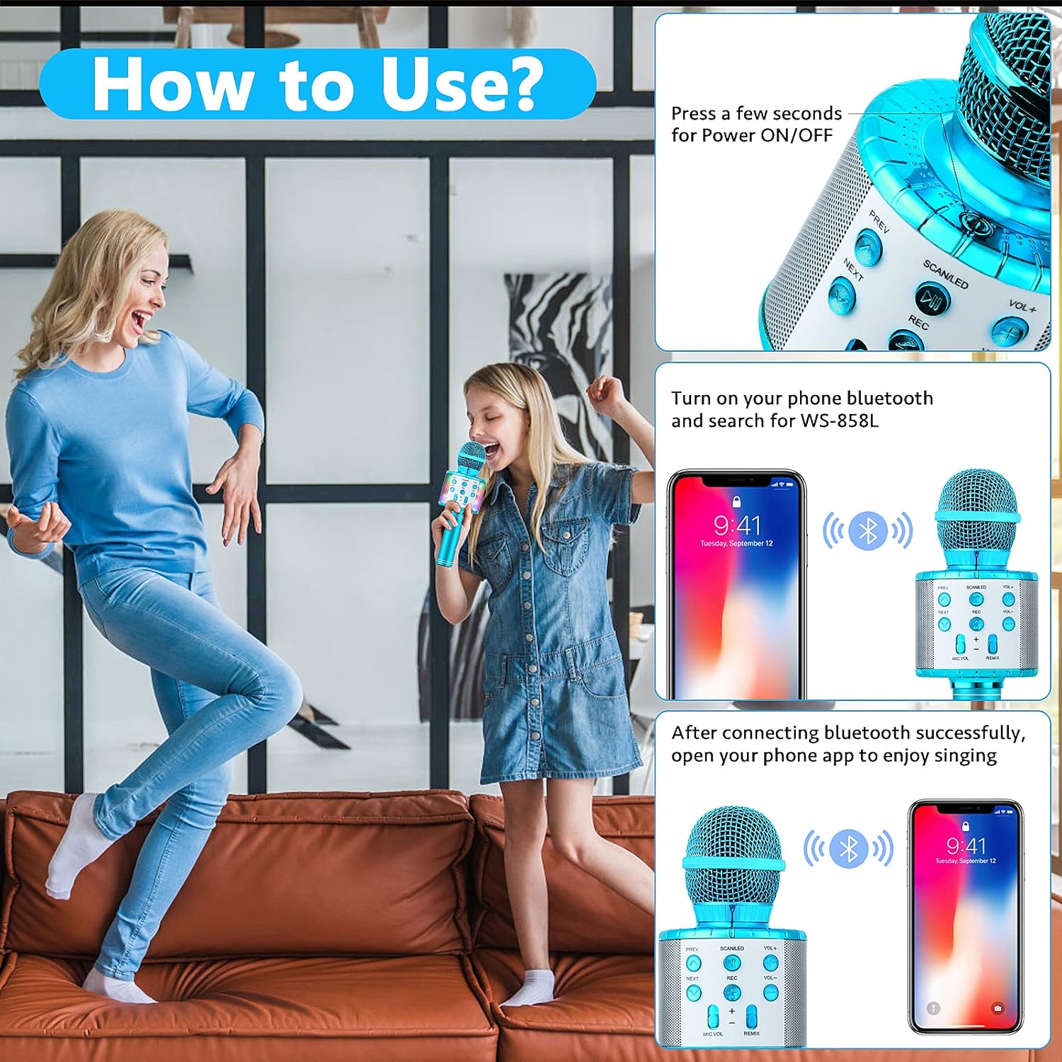 3 formas de conexión de micrófonos inalámbricos de mano: conexión Bluetooth, conexión de tarjeta TF (máximo 32 G, no incluida) y conector de audio de 3.5 mm (rango inalámbrico de 9.8 m). Este micrófono Bluetooth inalámbrico se puede utilizar como un micrófono de karaoke para cualquier dispositivo que sea compatible con Bluetooth. Simplemente enciende la función Bluetooth del teléfono, luego enciende el micrófono, el micrófono Bluetooth se conectará automáticamente