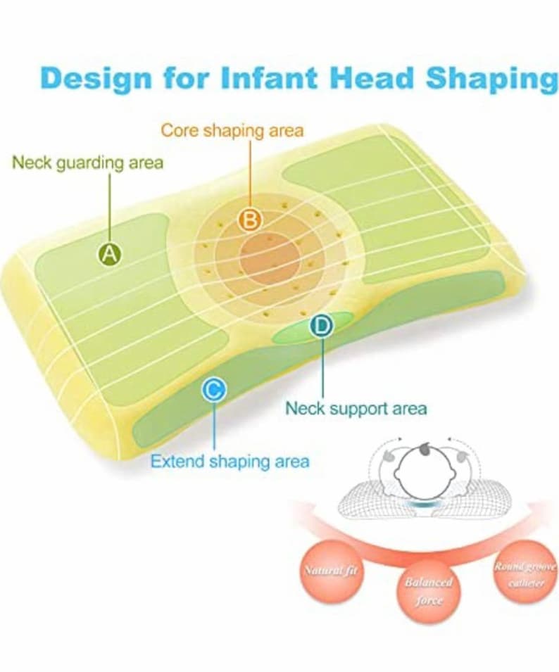 Una elegante almohada para bebés que no solo evita que su hijo desarrolle el síndrome de la cabeza plana, sino que también es muy cómoda y está hecha con una almohada y funda de espuma viscoelástica transpirable. Se protege de ácaros y bacterias. La funda/funda de algodón es suave, lavable y cómoda. La almohada es efectiva para bebés que duermen ligero, que sudan, que sufren de síndrome de cabeza plana y/o migrañas, y bebés que están amamantando.