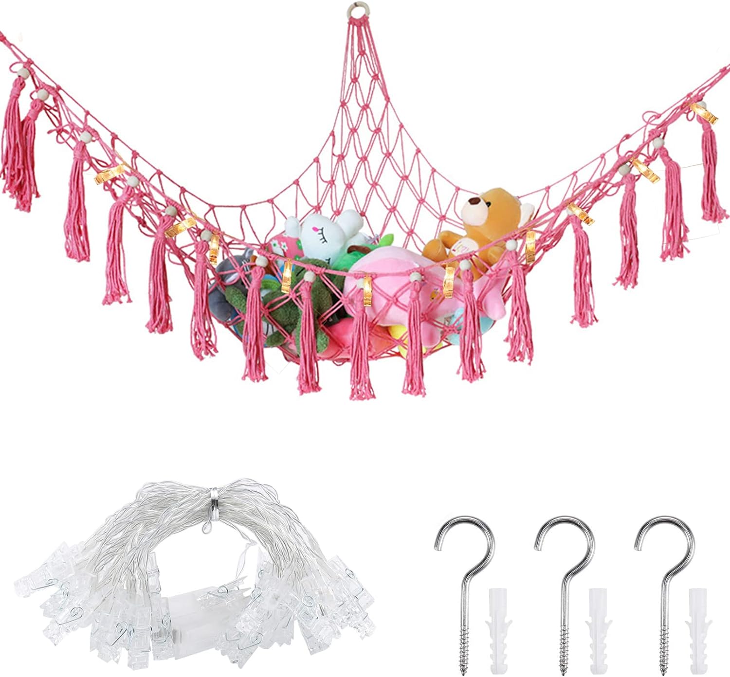 Especificaciones razonables: hamaca triangular de juguete Mlife para animales de peluche. Tamaño: 52 x 41 x 41 pies. Contiene tres ganchos y tubos de expansión, una cadena de luces de clip para fotos (tipo batería AA). Se puede colgar cómodamente en una esquina de la pared y sostiene toneladas de juguetes de animales de peluche para niños, y no ocupará espacio adicional en el suelo.