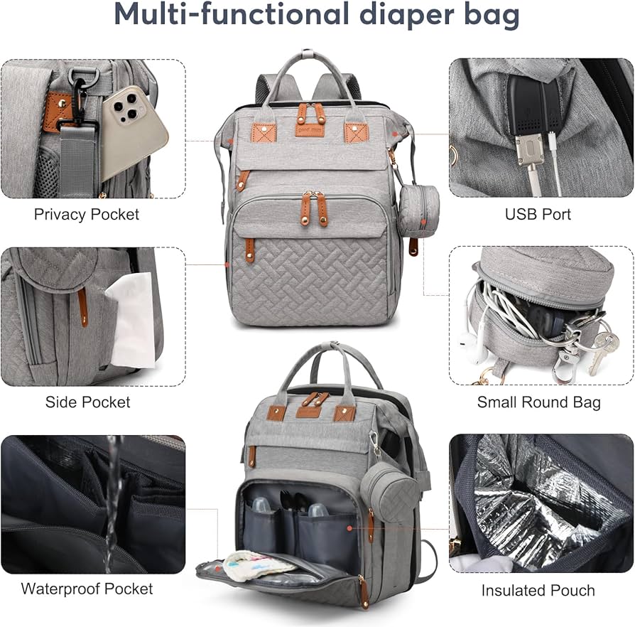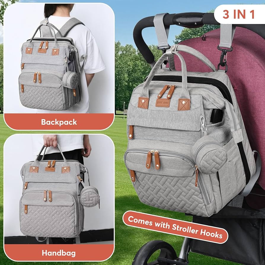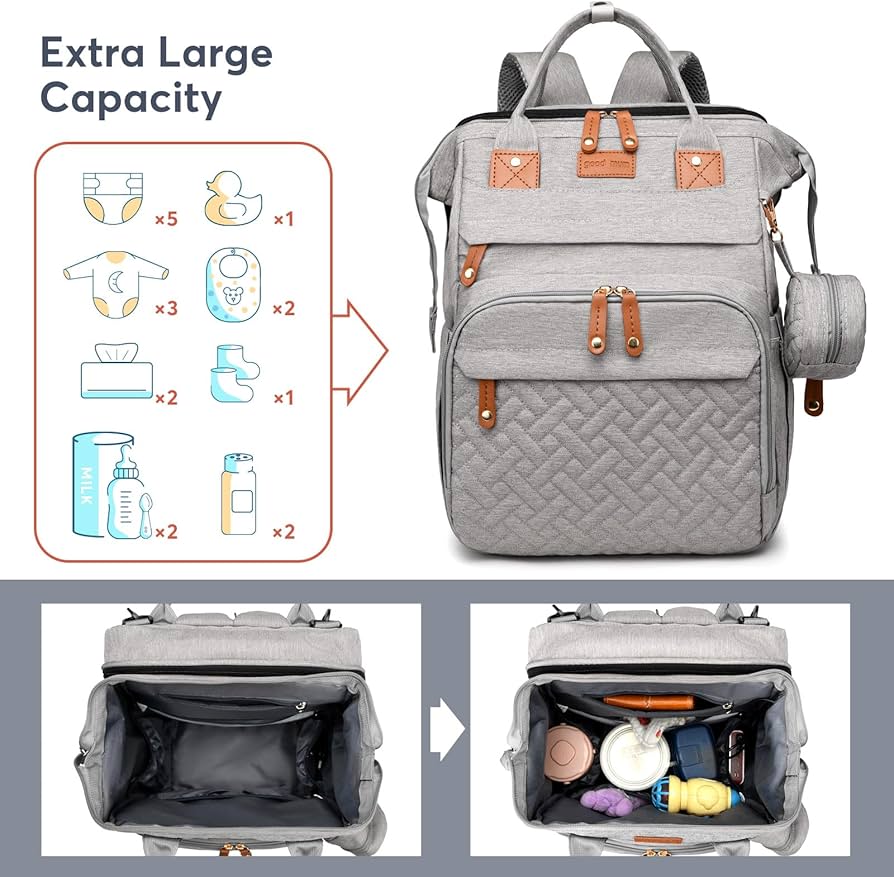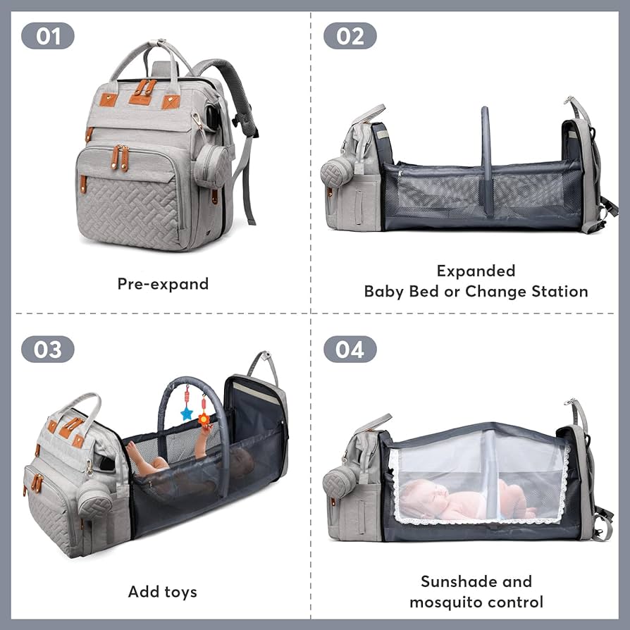 - Bolsa de pañales versátil con cambiador: esta es una bolsa de pañales versátil para bebés que se puede utilizar como mochila y viene con una práctica mesa para cambiar. Esta bolsa de pañales con cambiador te permite cambiar pañales fácilmente y proporciona espacio para que tu bebé descanse o juegue. Con un cambiador suave, transpirable y plegable, proporciona un lugar seguro, limpio y cómodo para que tu pequeño se acueste