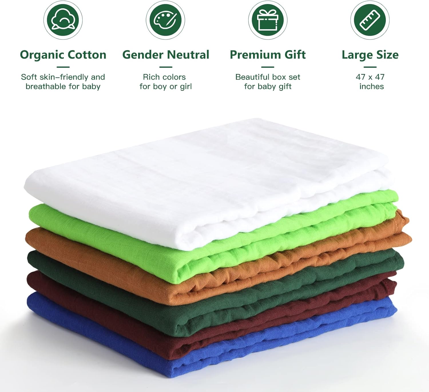 - PAQUETE DE 6 REGALO ÚNICO PARA RECIÉN NACIDO La caja de regalo premium está diseñada para hacer que nuestro producto sea diferente de los demás. El paquete de 6 mantas para envolver a bebés recién nacidos, 100% algodón orgánico, mide 47 por 47 pulgadas. El juego de caja de muselina para bebé es un regalo perfecto para recién nacidos, baby showers y regalos de cumpleaños para bebés.
