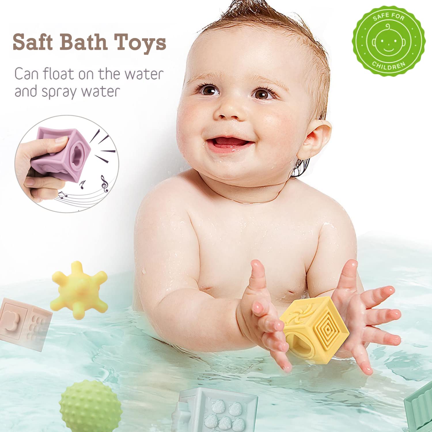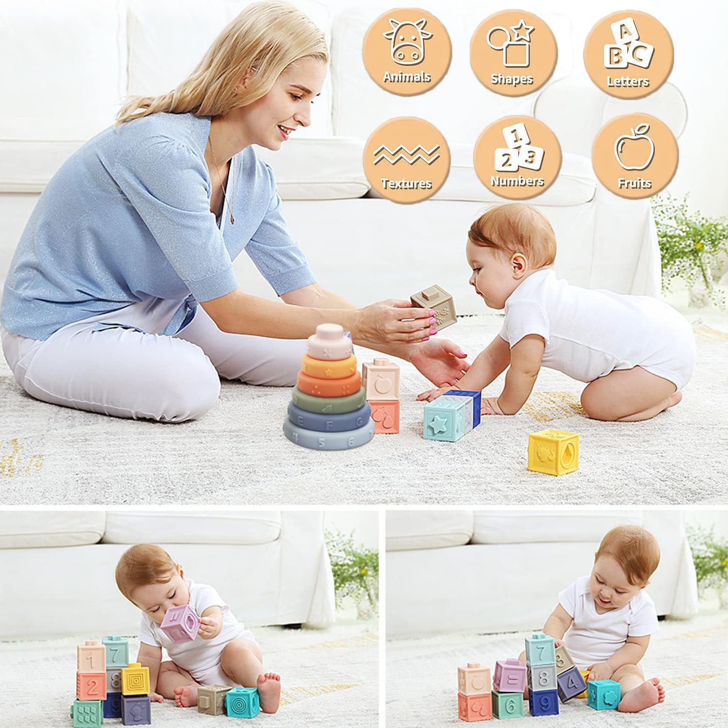 - Juego de aprendizaje temprano: el juego de juguetes 3 en 1 para bebé contiene 12 bloques suaves de diferentes colores, 6 anillos apilables suaves y 6 bolas sensoriales texturizadas. Estos juguetes Montessori son ideales para aprender colores, formas, texturas, contar. El bebé puede coincidir con las formas, aprender los números. También son ideales para habilidades motoras finas y coordinación ojo-mano