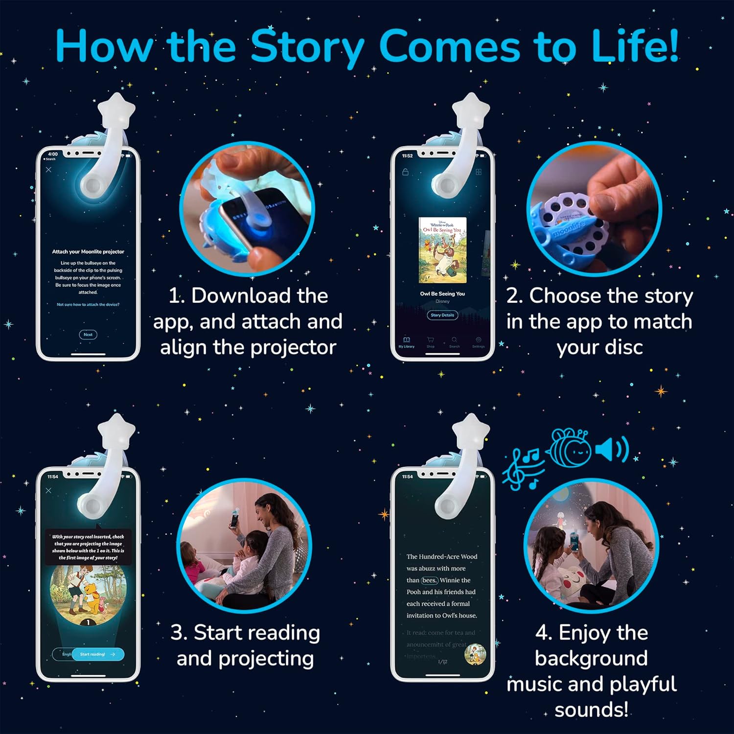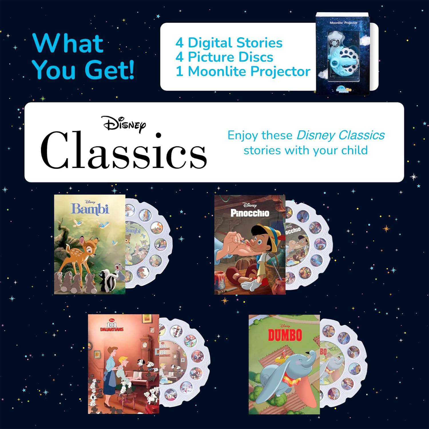 Moonlite - Miniproyector de cuentos con 4 historias de clásicos de Disney