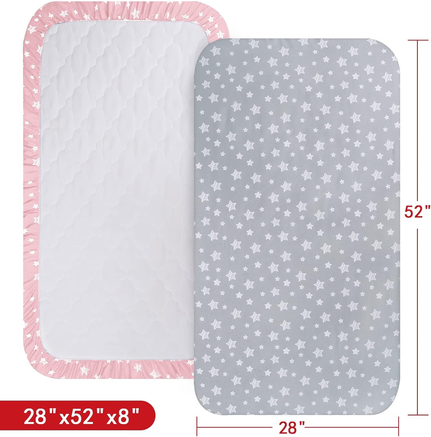 Ajuste cómodo con tamaño estándar: el paquete de 2 sábanas para cuna se adapta perfectamente a la mayoría de colchones estándar de cuna y colchones para niños, dimensiones 52 x 28 x 8 pulgadas. Nuestras sábanas bajeras de cuna tienen una banda elástica alrededor de todo el borde, una característica que hace que la sábana sea más segura para los bebés.