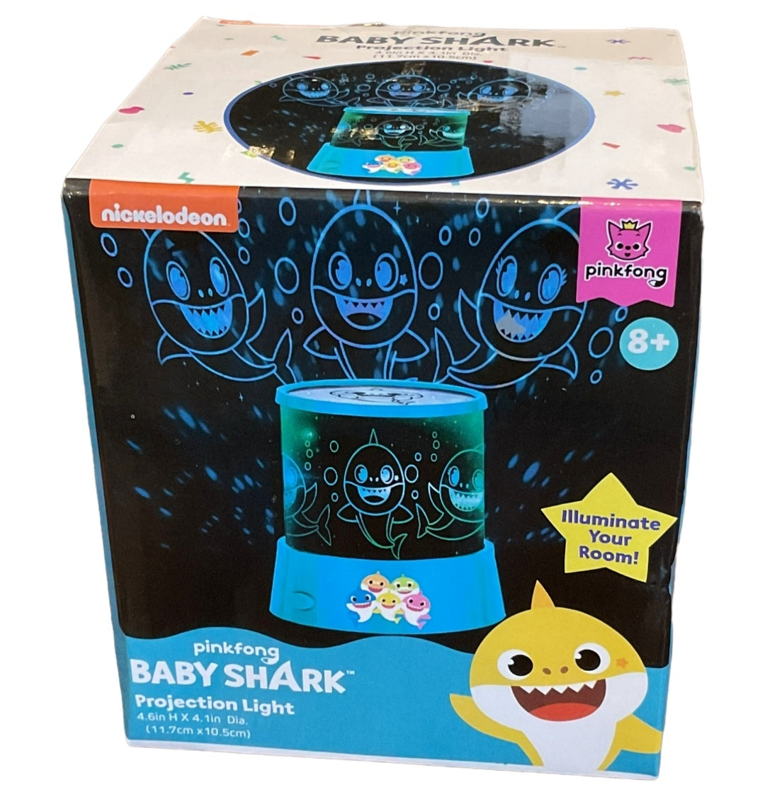 *Caja con detalles* Disfruta de la proyección de luz azul de los dibujos favoritos de Baby Shark en una pequeña lámpara pero de gran potencia con medidas de 4,6"x4,1".
