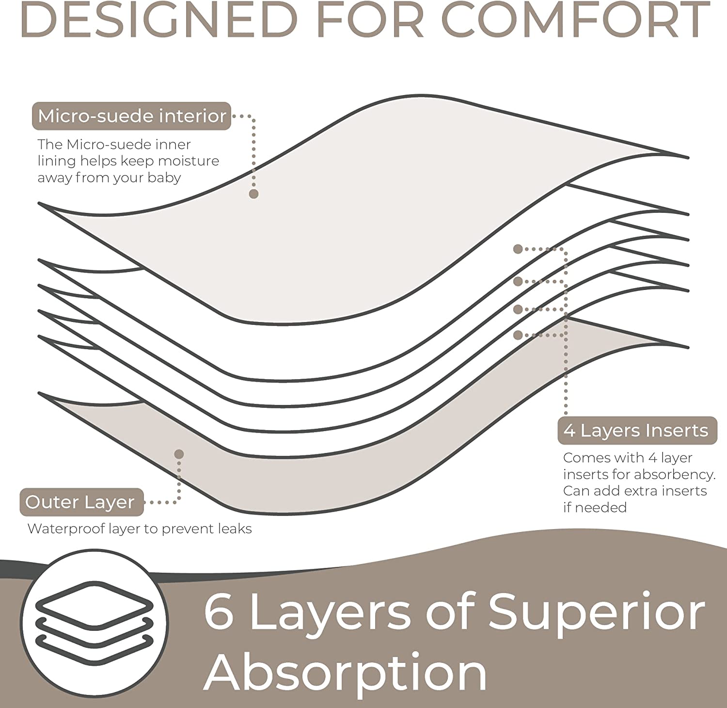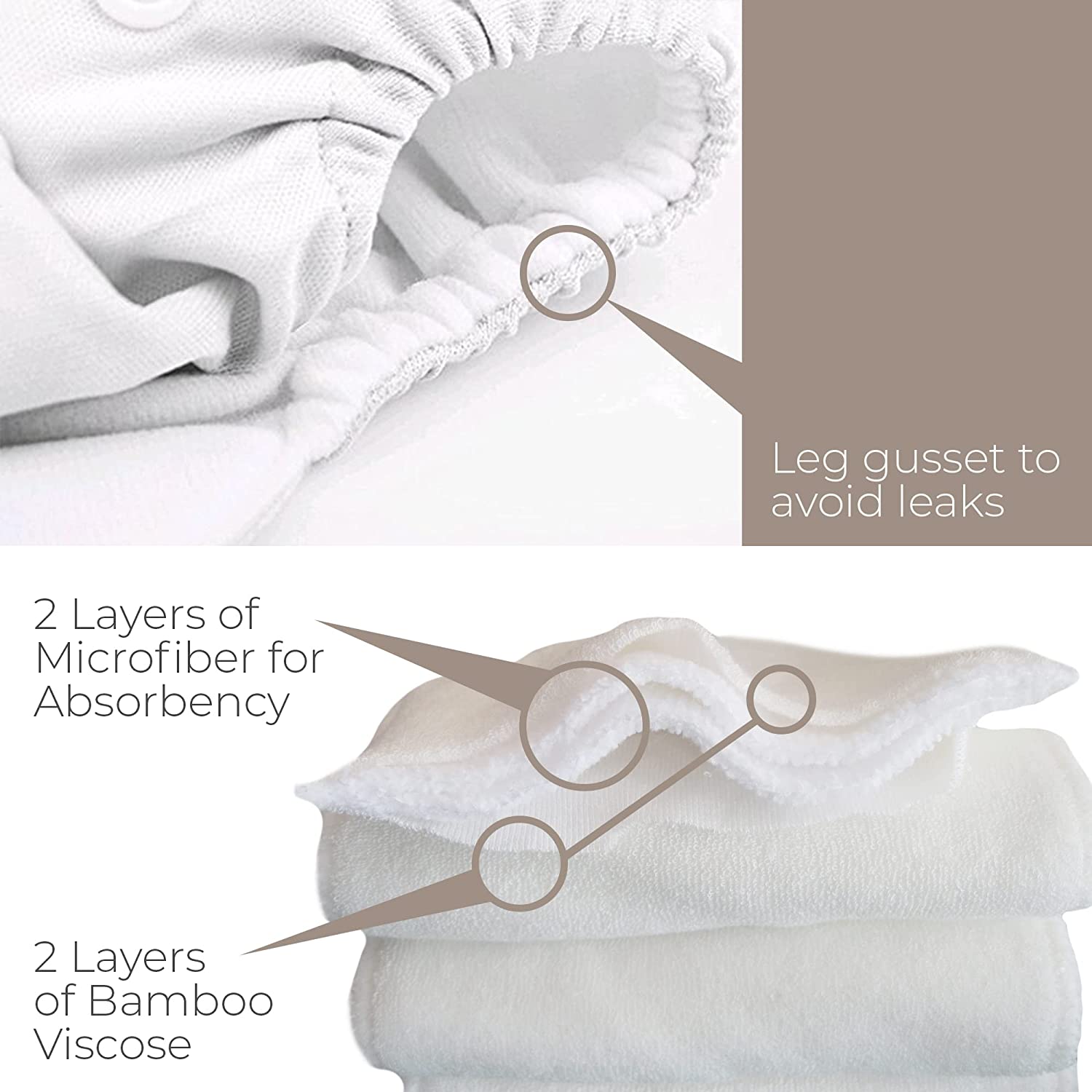 No más fugas, máxima comodidad y elección ecológica: experimente la máxima comodidad y una opción ecológica con nuestros pañales de tela ajustados para bebés. Con aberturas ajustadas para las piernas y una cubierta exterior impermeable, nuestros pañales de tela garantizan días y noches sin preocupaciones. Nuestras innovadoras inserciones, con 2 capas exteriores de bambú y 2 capas interiores de microfibra, ofrecen una absorción superior que se vuelve más suave con cada lavado. Nuestros forros de tela para pañales brindan una protección confiable contra manchas, suciedad y fugas.