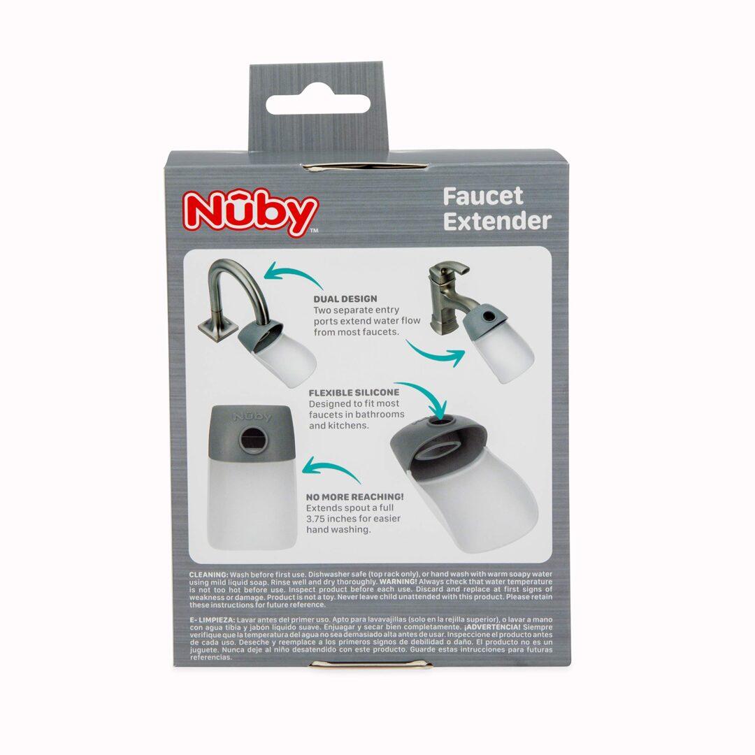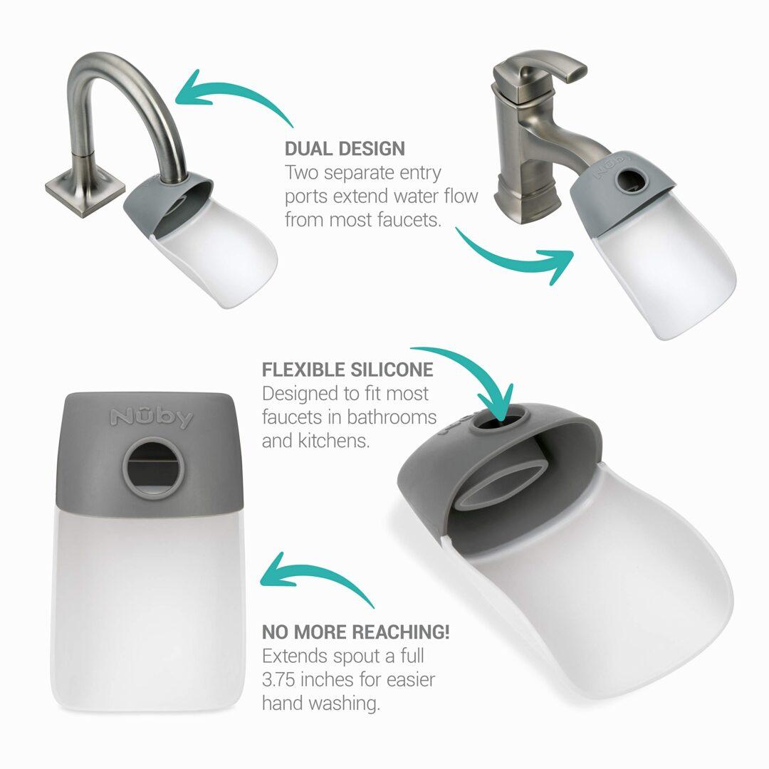 Los extensores de grifo Nuby cuentan con un diseño Multi-Fit. Los puertos de entrada estirables se adaptan a la mayoría de los grifos en baños y cocinas.