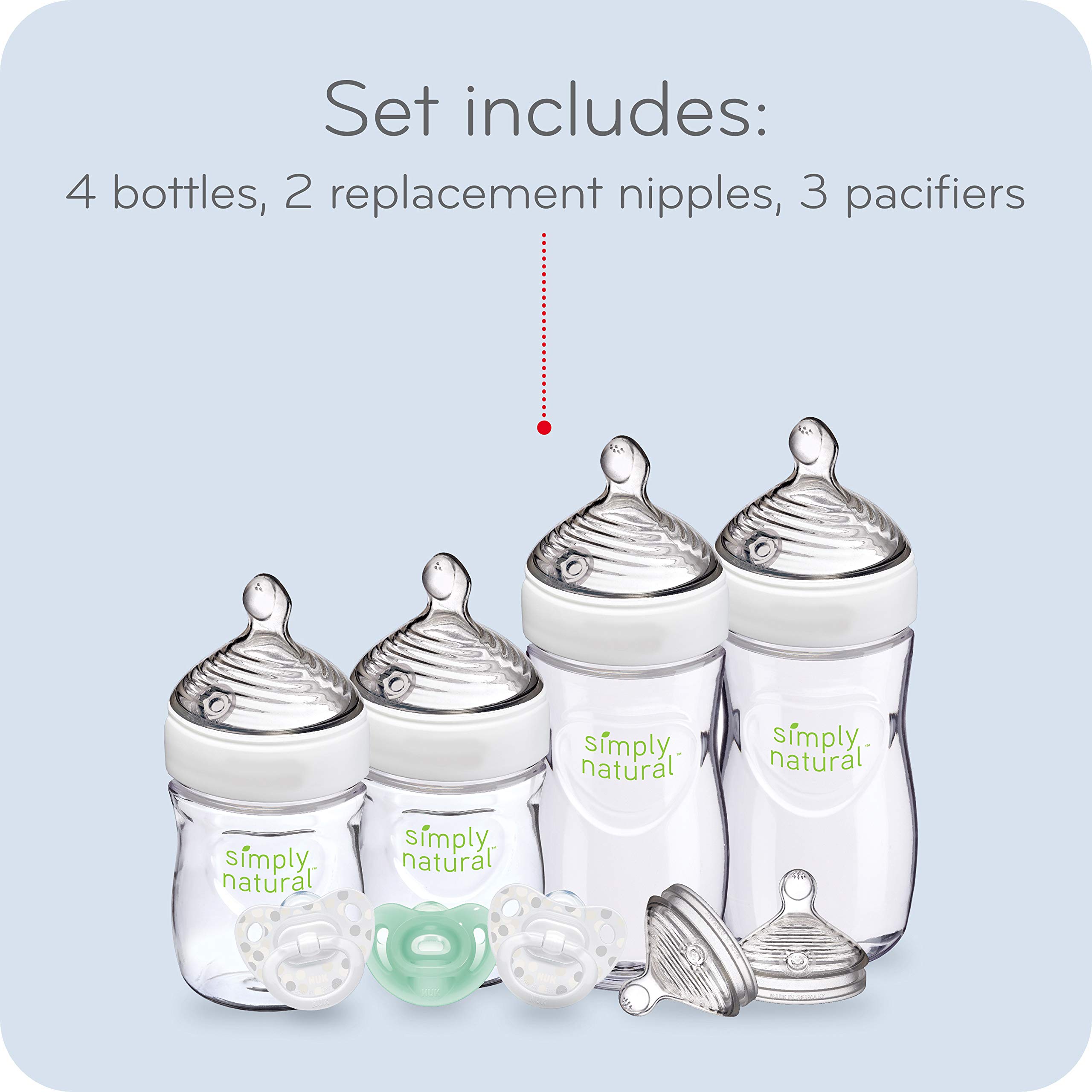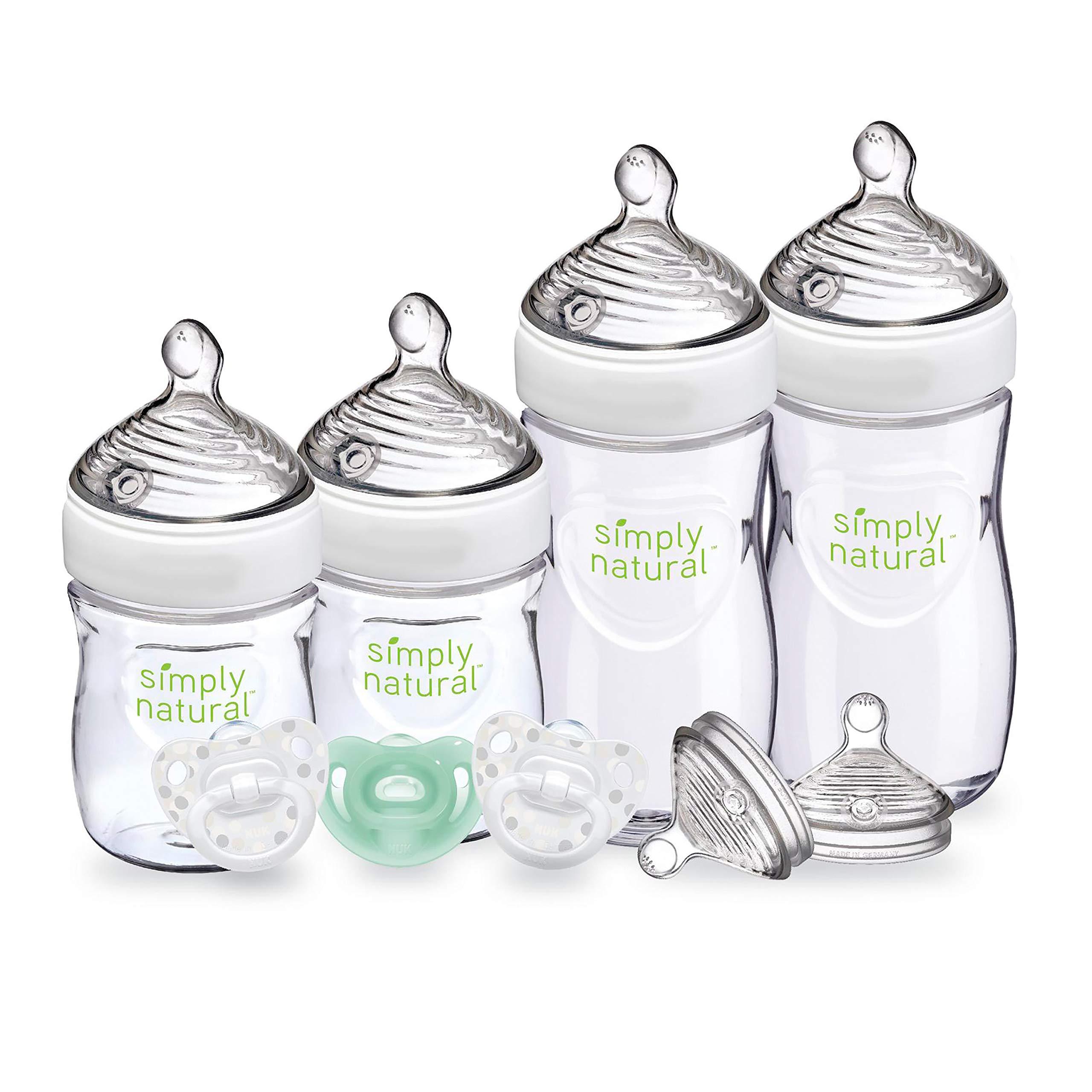 - El juego de 9 piezas incluye: 2 botellas de 5 oz con tetina de flujo lento, 2 botellas de 9 oz con tetina de flujo medio, 2 boquillas de flujo rápido con 9 agujeros, 3 chupetes ortodónticos 100% silicona (un chupete recién nacido y dos chupetes recomendados para niños de 6 a 18 meses)