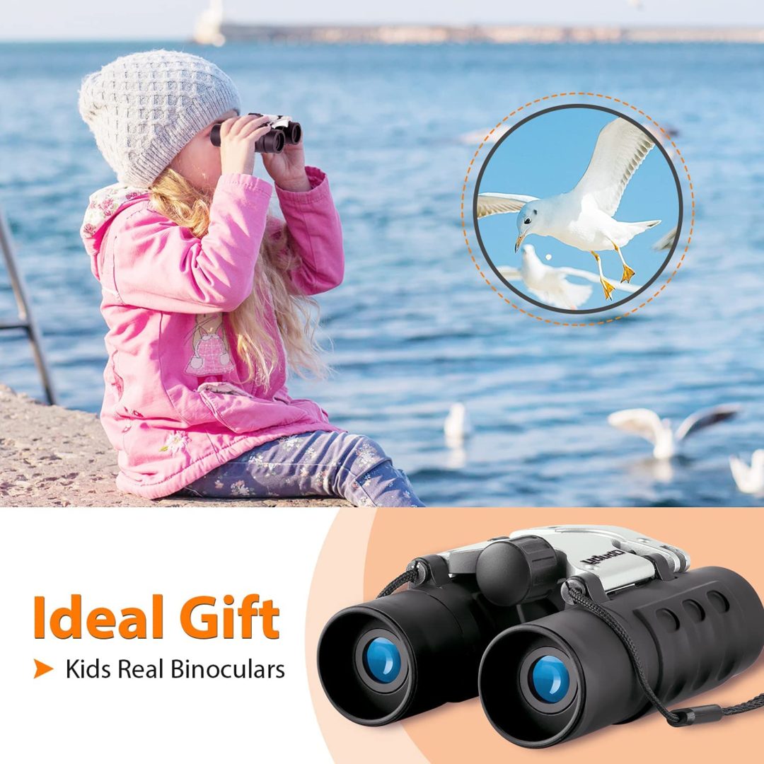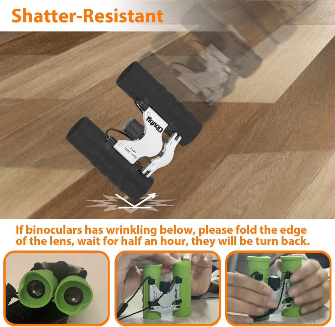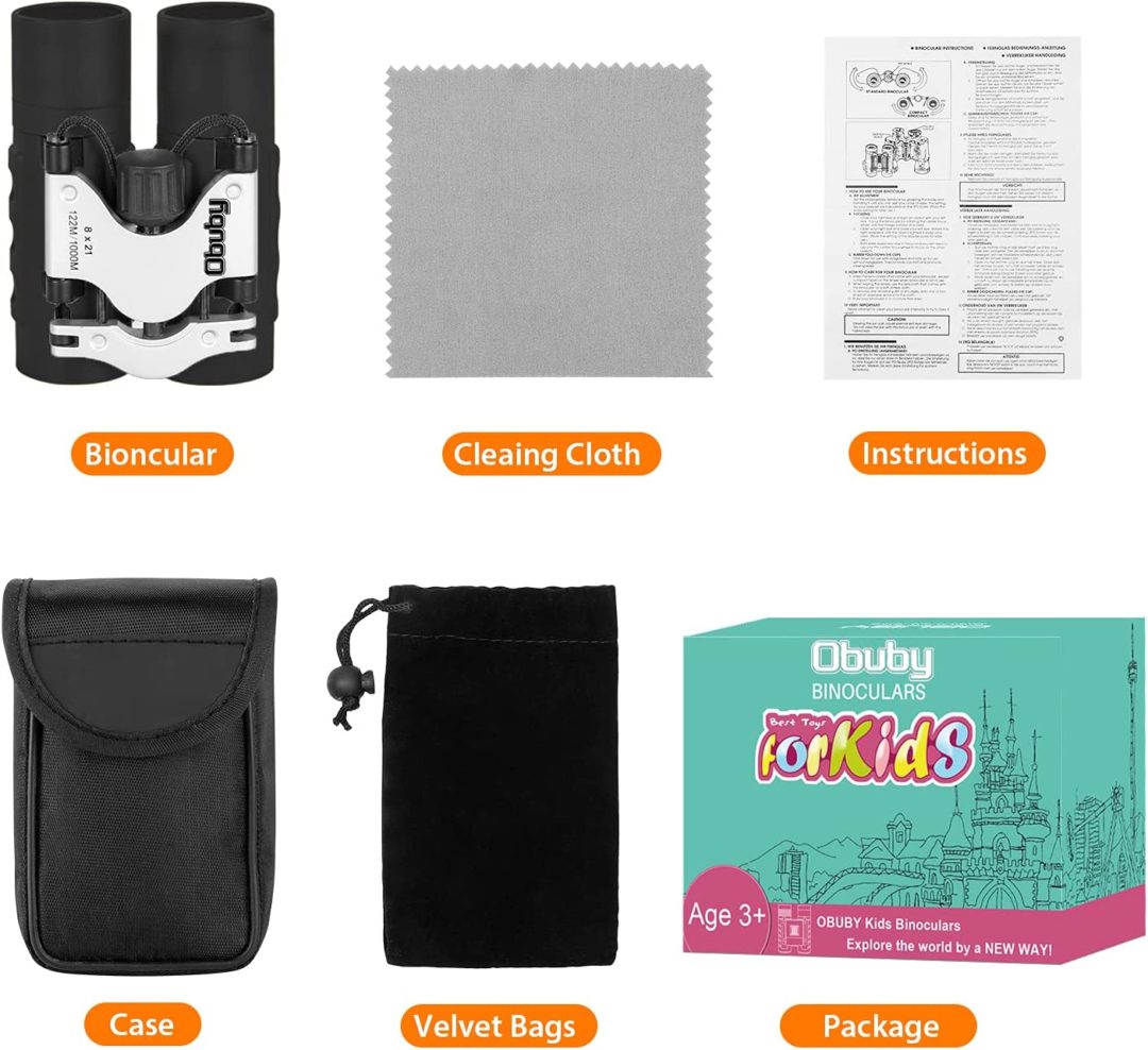 *Caja con detalles*. Juguete de súper seguridad: Se incluyen oculares rodeados de goma suave para la protección de los ojos, para que los niños no se lastimen los ojos o la cara. Antideslizante, la empuñadura ha sido ergonómicamente patentada para adaptarse a las manos de los niños.La magnífica amplificación de alta resolución de 8X con el ángulo de visión de 7.2°, su hijo puede ver todo el amplio campo visual para capturar objetos fácilmente. El prisma BAK 4 FMC verde de varias capas con revestimiento de banda ancha puede controlar la reflexión óptica para crear imágenes nítidas y coloridas.