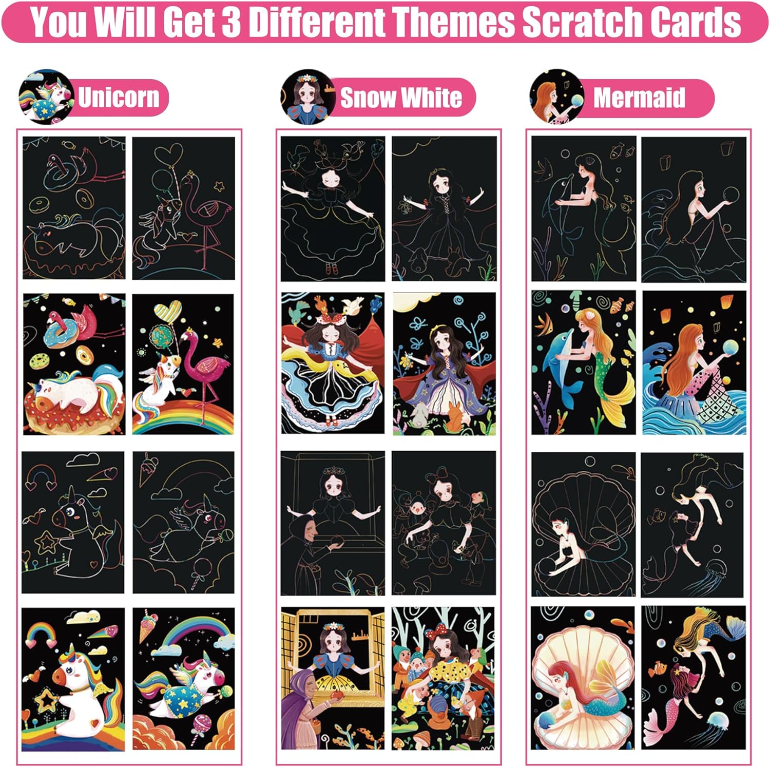 OPUHOHR - Juego de 3 tarjetas de rascar para niños, princesa/unicornio/sirena