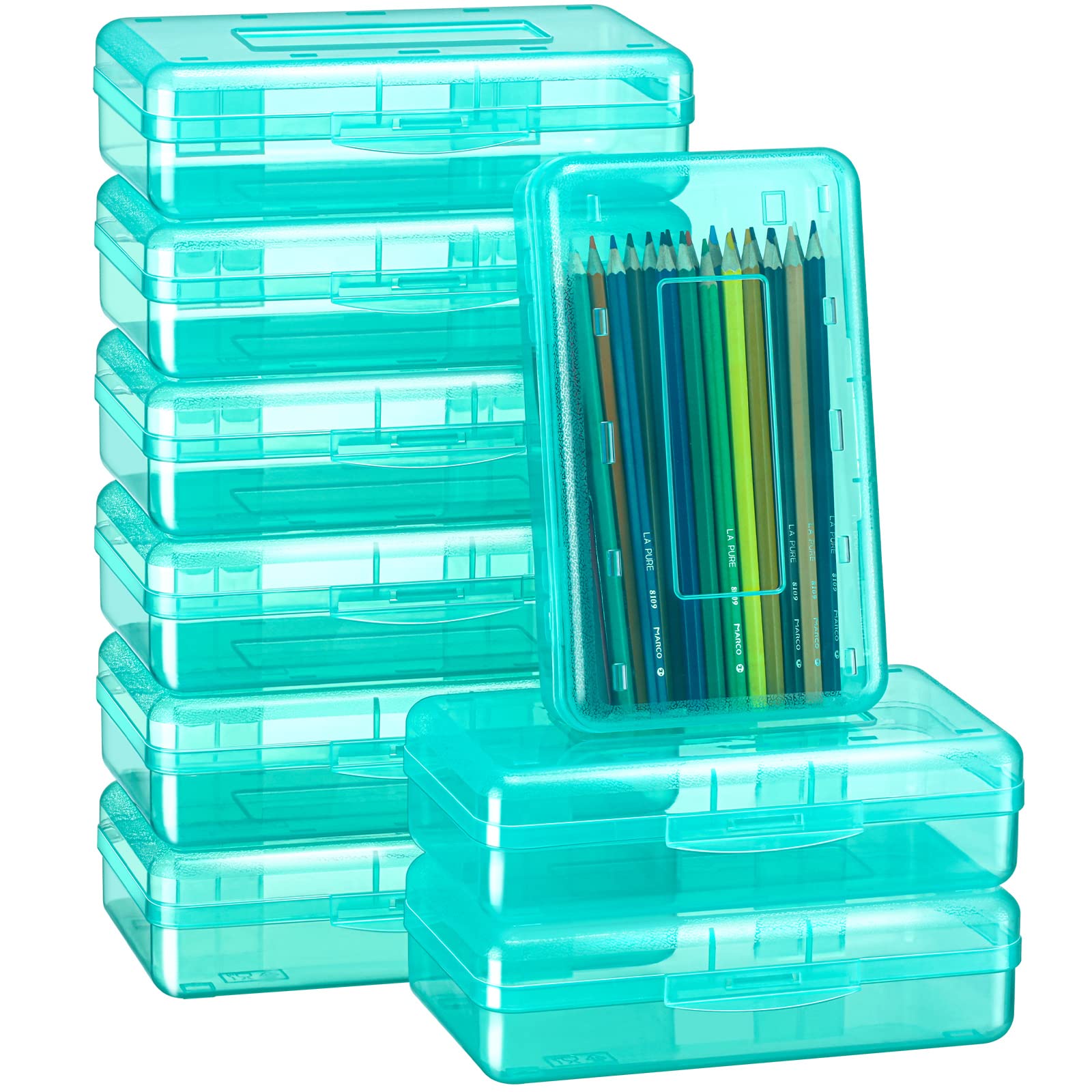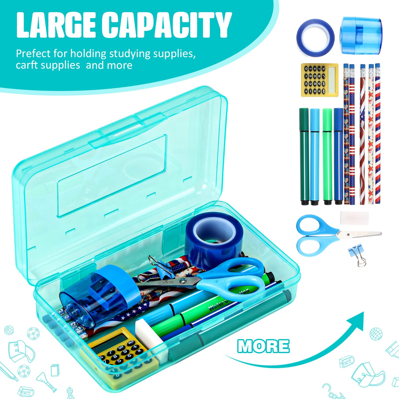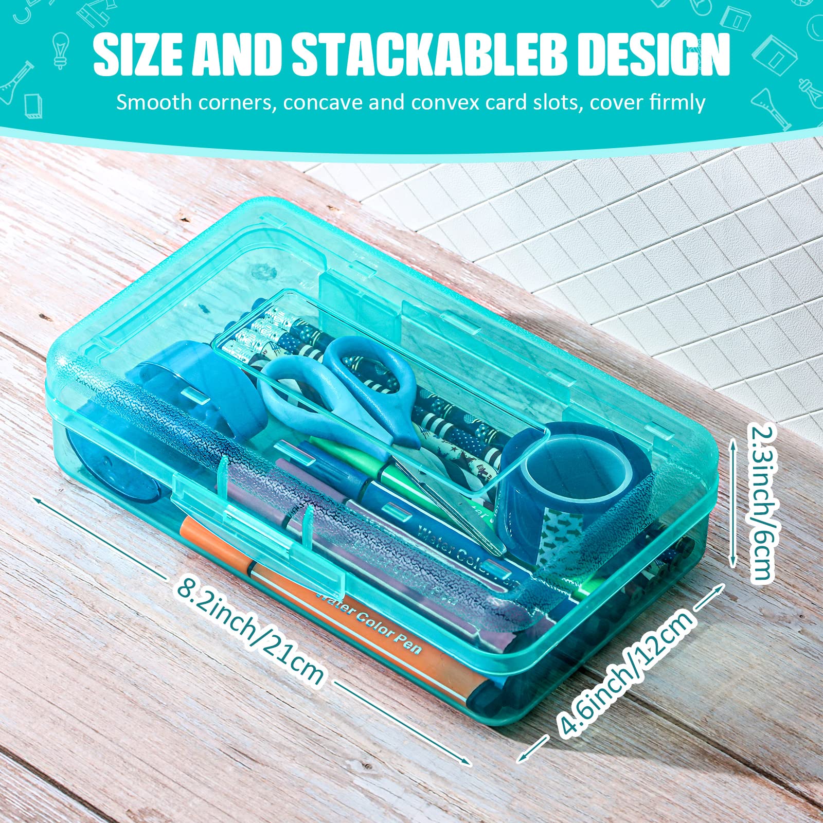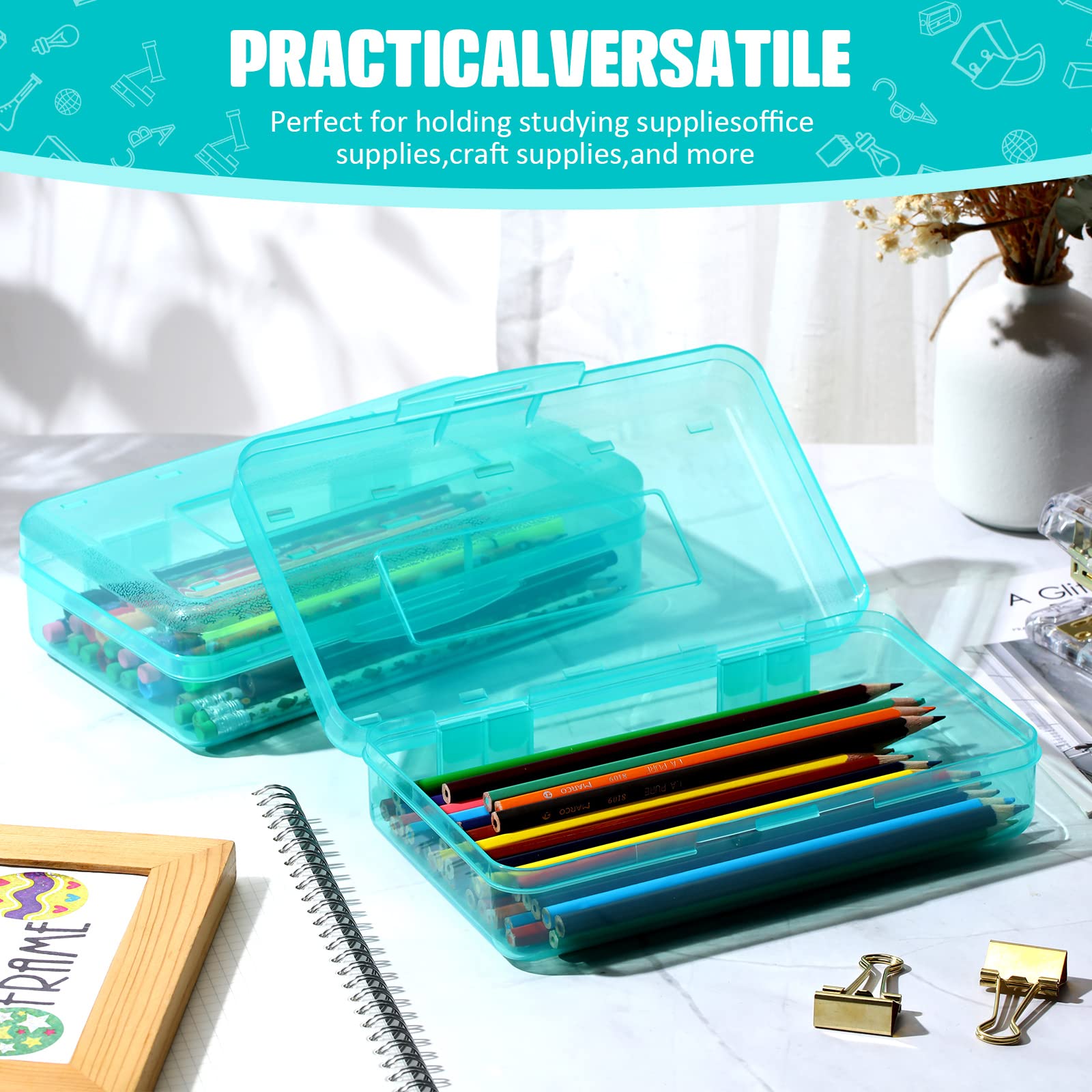 Gran capacidad: estos recipientes de plástico miden aproximadamente 8.2 x 4.6 x 2.3 pulgadas, pueden almacenar muchas cosas pequeñas, puedes poner tus suministros de oficina o suministros de manualidades en la caja de lápices, como bolígrafos, crayones, sacapuntas, borrador, cintas, abalorio, hilo, herramientas pequeñas, adornos pequeños, etc