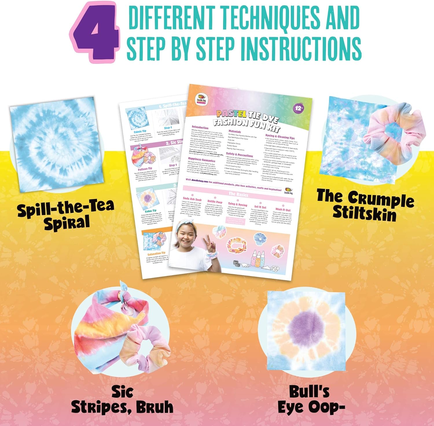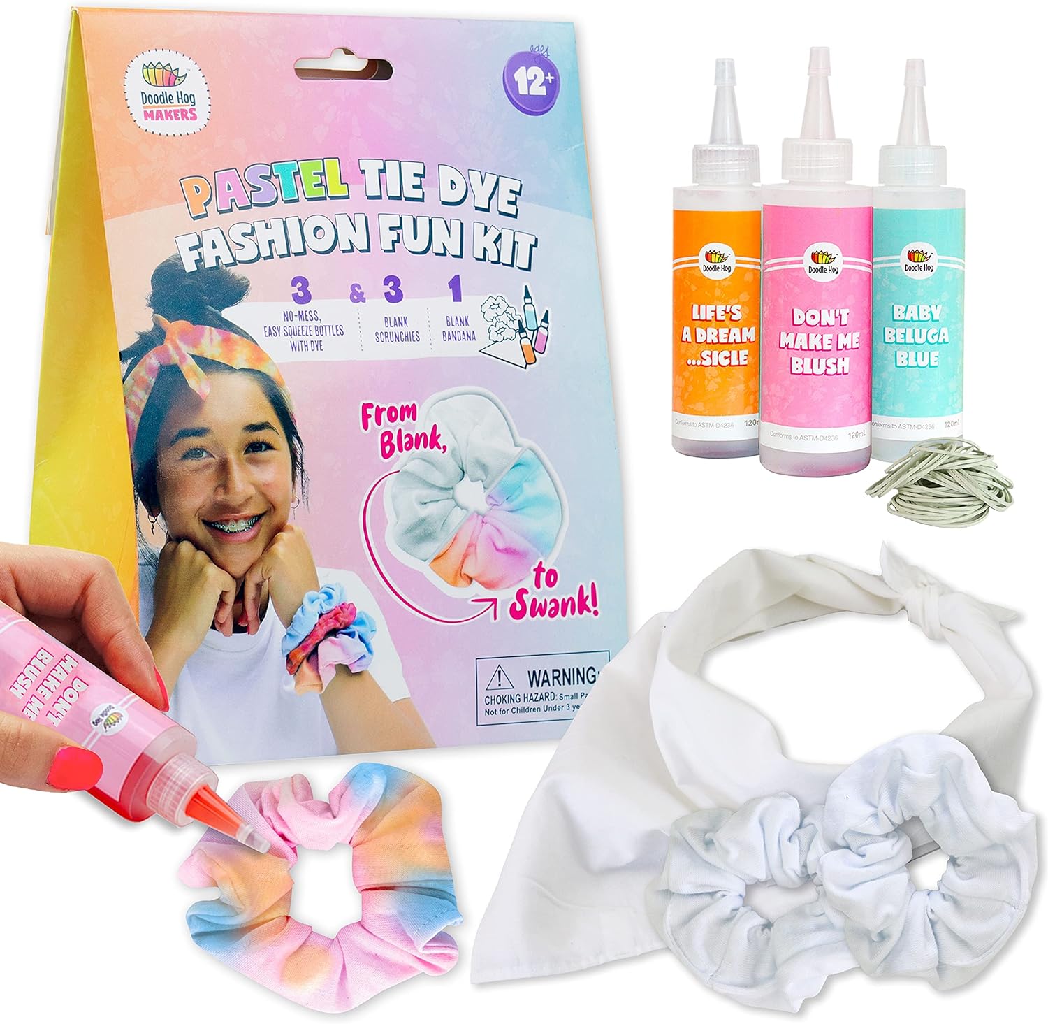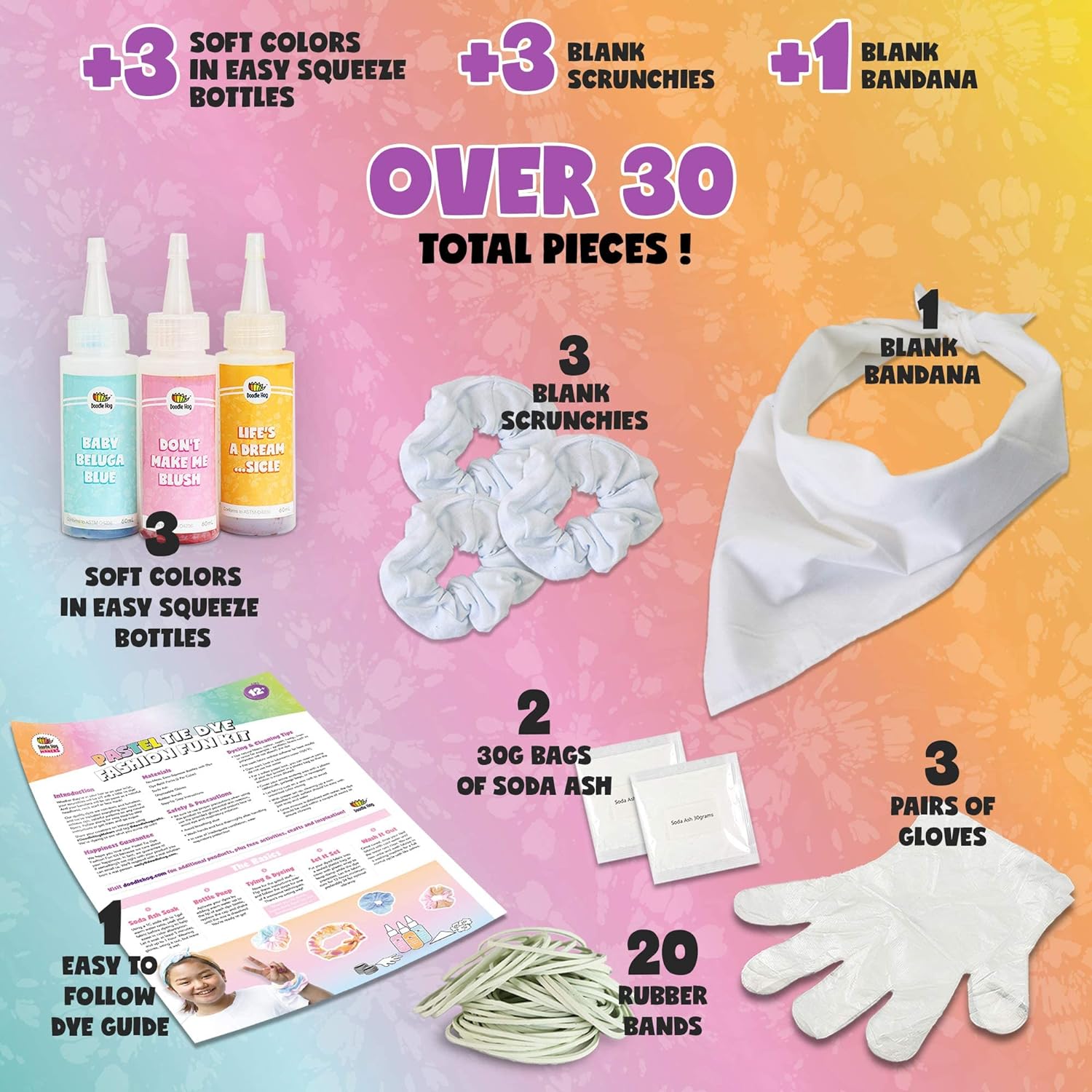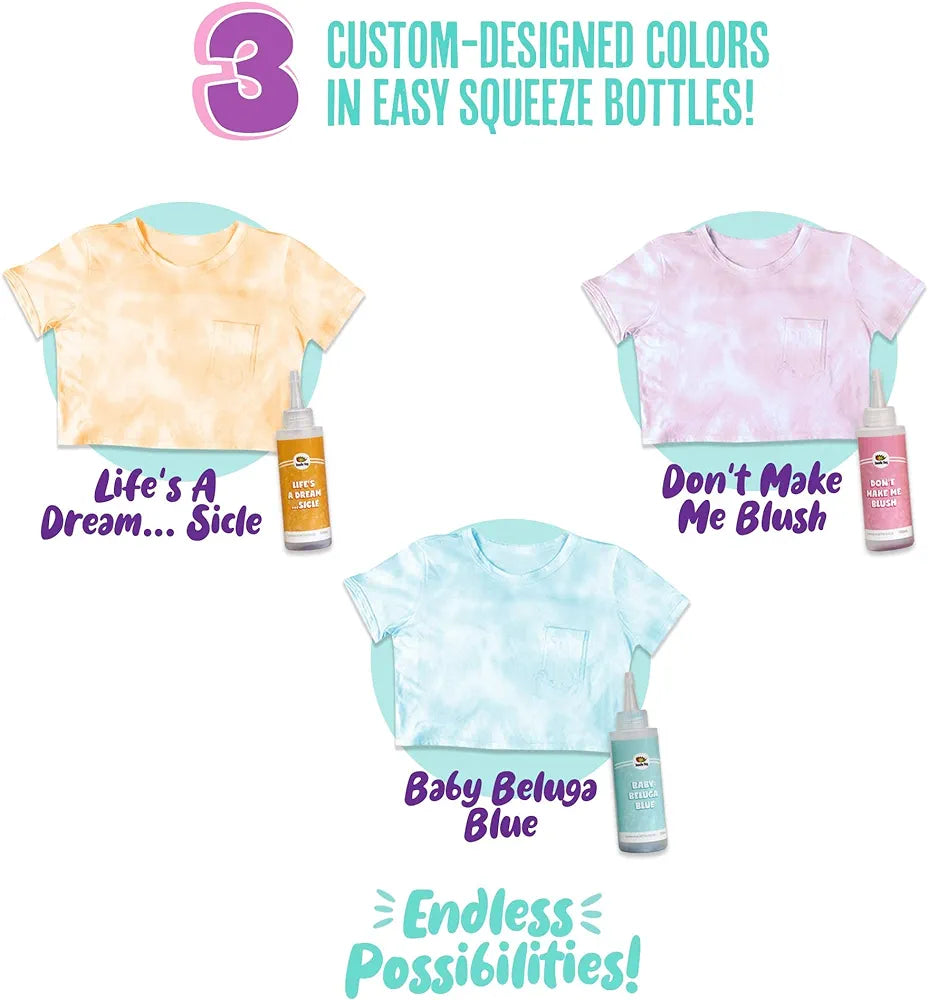 Moda que puedes hacer tú mismo: este kit de teñido anudado incluye 3 tintes de colores personalizados (don't Make Me Blush, Life's A Dream...sicle, Baby Beluga Blue) en botellas fáciles de apretar. También se incluye en el kit: 3 coleteros en blanco, 1 pañuelo en blanco, 2 bolsas de carbonato de sodio, 3 pares de guantes, 20 bandas elásticas y una guía de técnicas de tinte fácil de seguir.