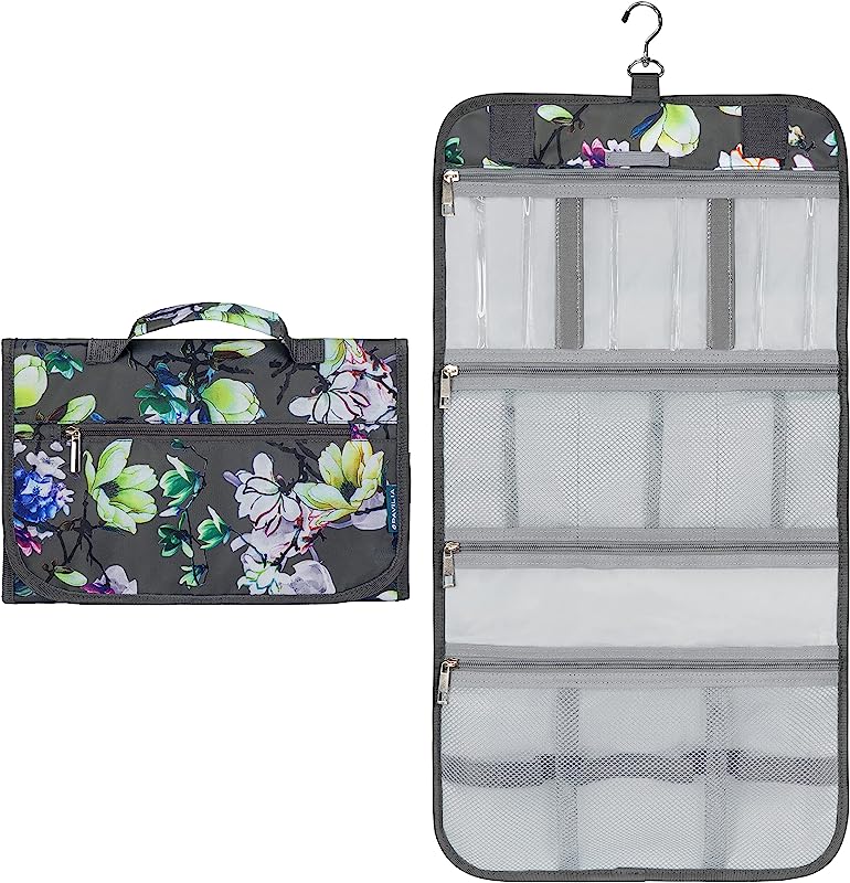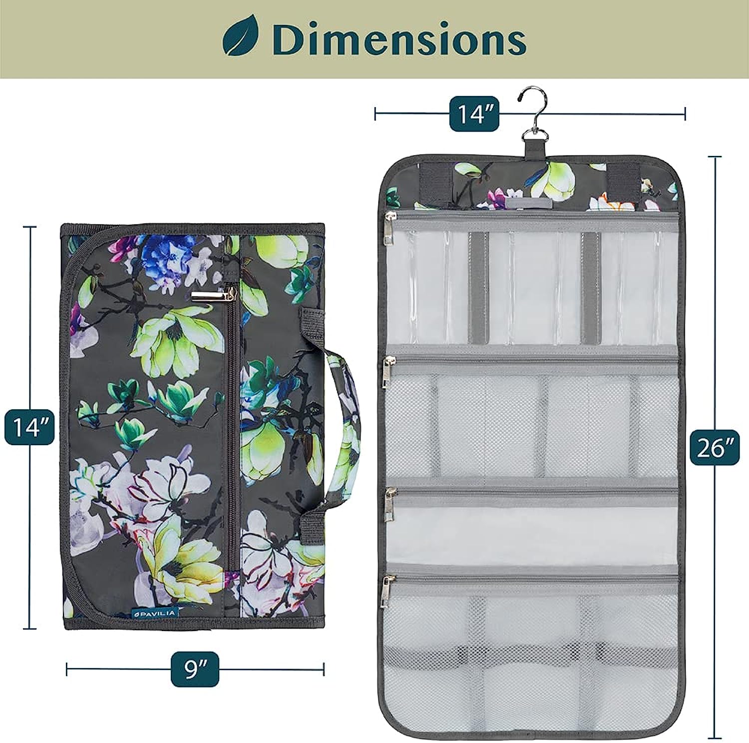 NECESER DE VIAJE PLEGABLE: El estuche organizador de artículos de tocador de viaje grande PAVILIA tiene 4 compartimentos principales para adaptarse a todos sus recipientes de artículos de tocador de viaje, maquillaje y botellas de cosméticos. El bolsillo con cremallera en la parte delantera tiene lo esencial cuando el neceser está doblado. Los bolsillos impermeables enrollables pueden contener crema para el cuidado de la piel, champú, brocha de maquillaje, cepillo de dientes y artículos húmedos. Este es un viaje imprescindible para vacaciones, vuelos, gimnasio, crucero y hogar. Tamaño grande de 14 x 9 x 2 pulgadas (largo x ancho x alto), tamaño desplegado 14 x 26 x 1