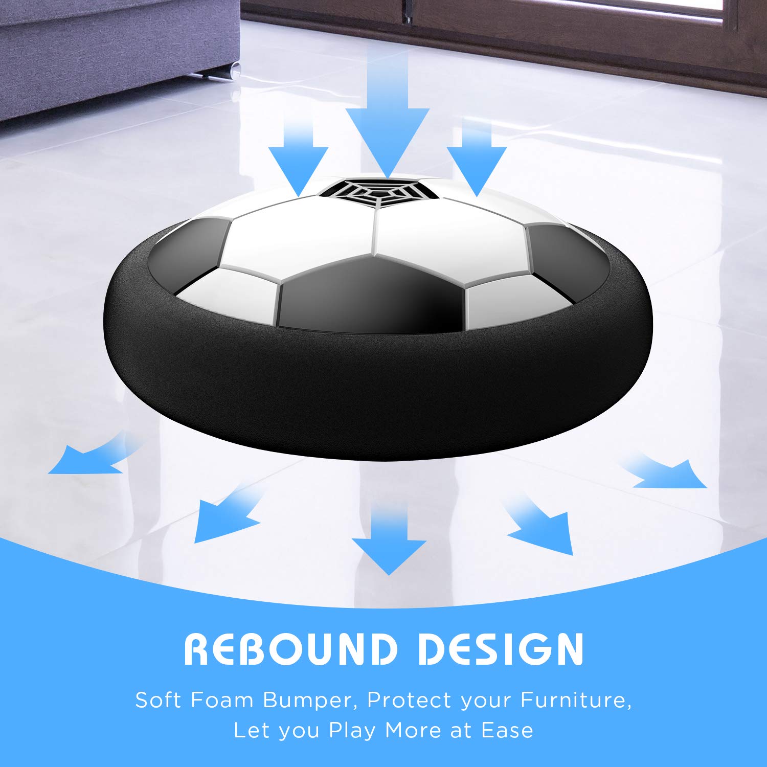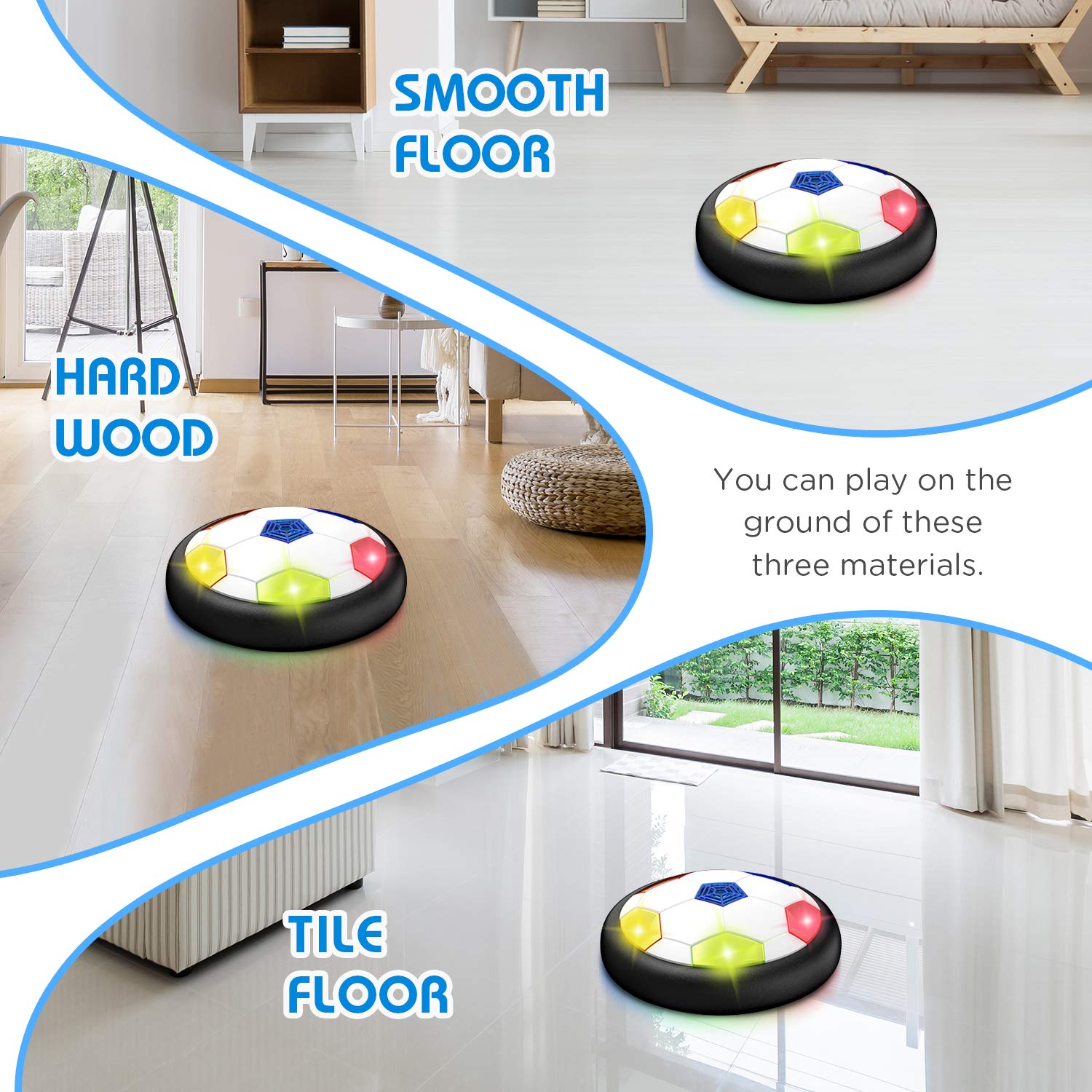 Se mueve fácilmente en el suelo de madera dura: la pelota de fútbol iluminada flota en su propio cojín de aire, lo que ayuda a que se deslice y rebote fácilmente. Todo el material es muy seguro al tacto. El borde de espuma suave y flexible no solo puede proteger a los niños de lesiones, sino también proteger tus muebles y otras cosas de daños.