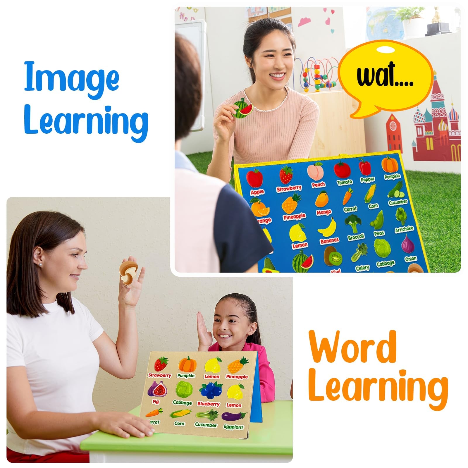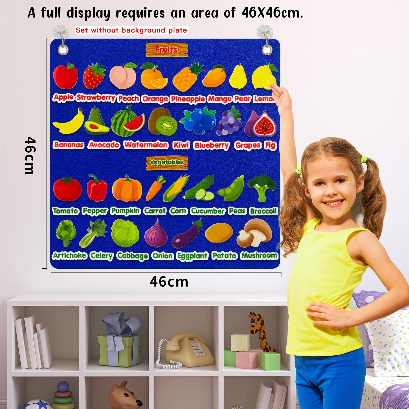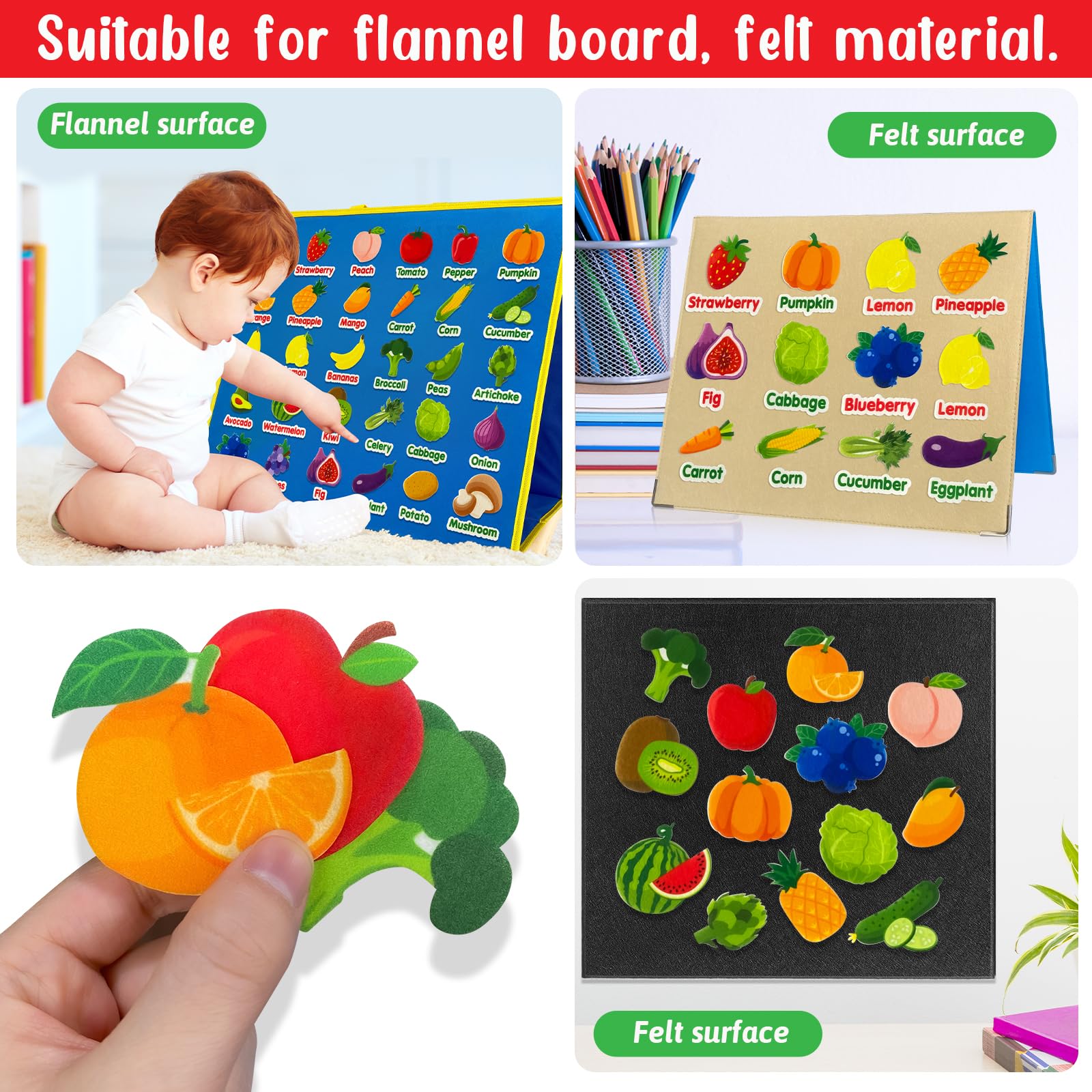 Piezas de aprendizaje de frutas y verduras de fieltro, 62 piezas