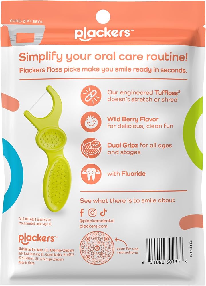 Plackers Palillos de hilo dental Dual Gripz para niños con mango de doble agarre, sabor a bayas silvestres, 90 unidades