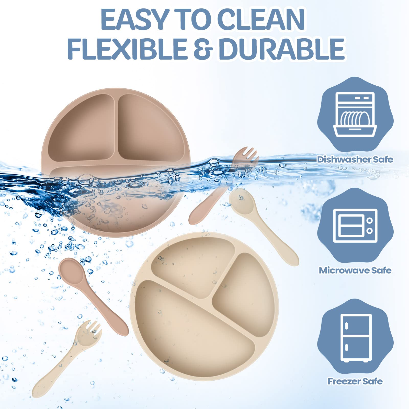 Seguro de usar: hecho de material de silicona seguro, la cuchara de silicona para niños pequeños, tenedores y platos para niños pequeños con succión son inodoros y no tóxicos, sin BPA, PVC, ftalatos, látex, seguro para que los bebés usen. Y son resistentes y útiles, por lo que no tienes que preocuparte de que se rompan cuando se caen
