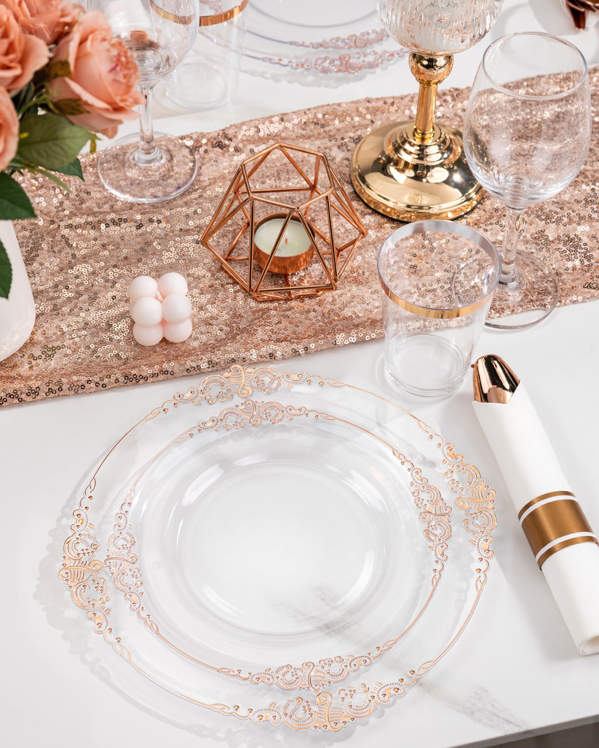 Platos de plástico color oro rosa transparente, elegante juego de vajilla desechable adecuado para 25 invitados,