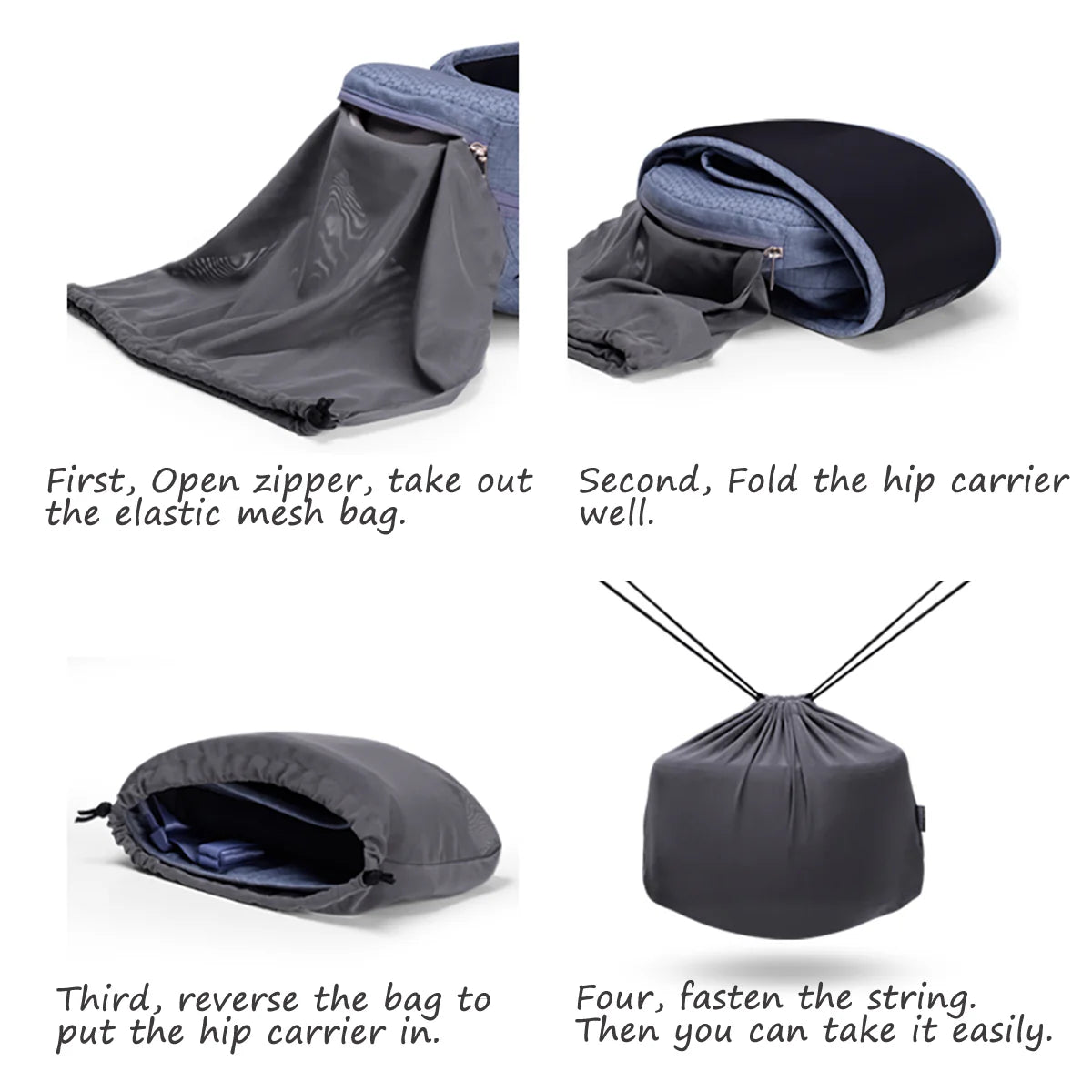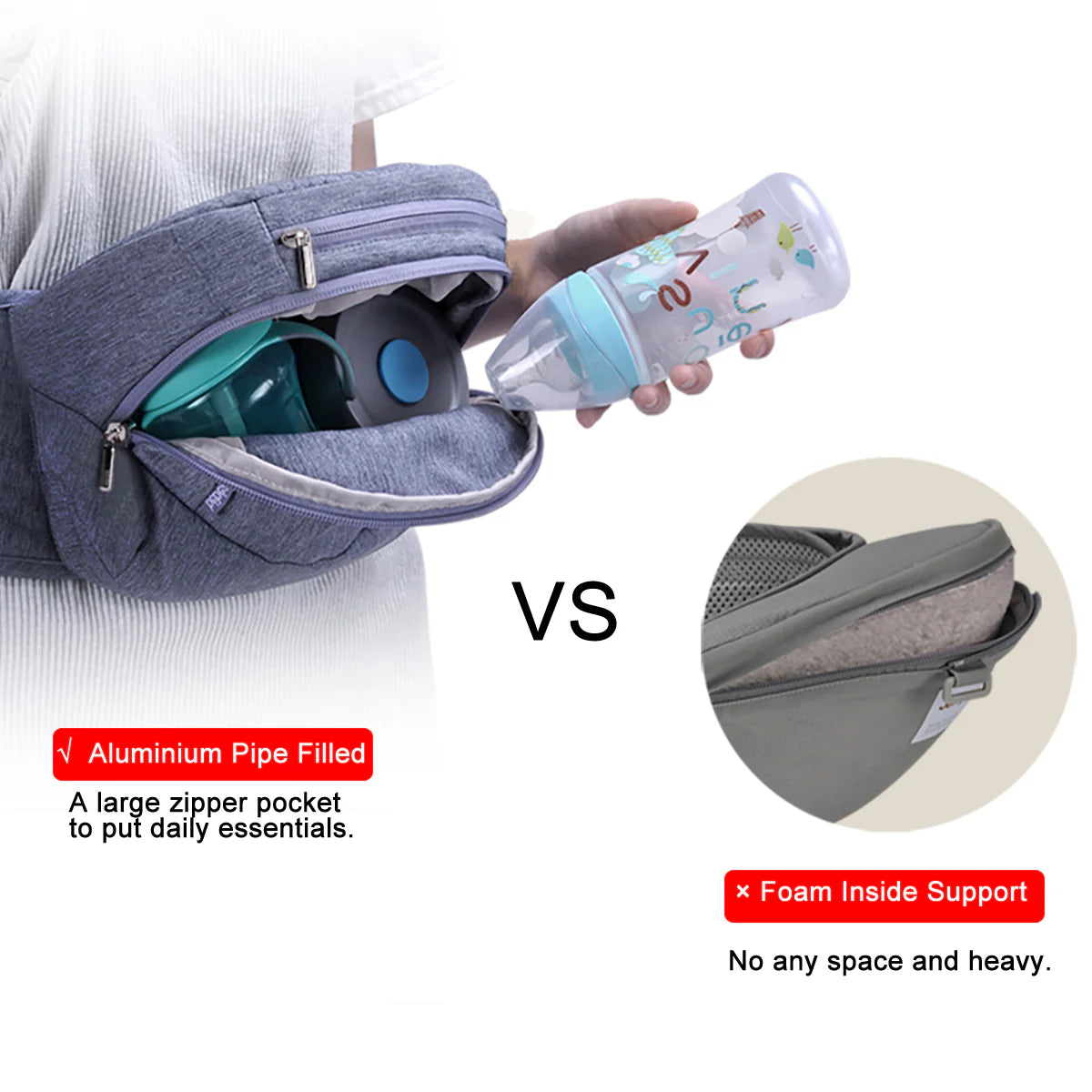 El asiento de cadera cuenta con un soporte de tubo de aluminio plegable. Al salir, puede plegarlo y guardarlo fácilmente en la bolsa. 2 bolsillos con cremallera: uno frontal con cremallera para biberones y pañales, y otro lateral con cremallera para el teléfono móvil u otros objetos pequeños. 3 estilos de transporte diferentes: horizontal, mirando hacia dentro y mirando hacia delante. Gran capacidad de 15 kg para bebés de 0 a 36 meses. Correa de cintura acolchada y ajustable que reduce el dolor y la presión. Cintura para padres de hasta 118 cm (46,4 pulgadas).