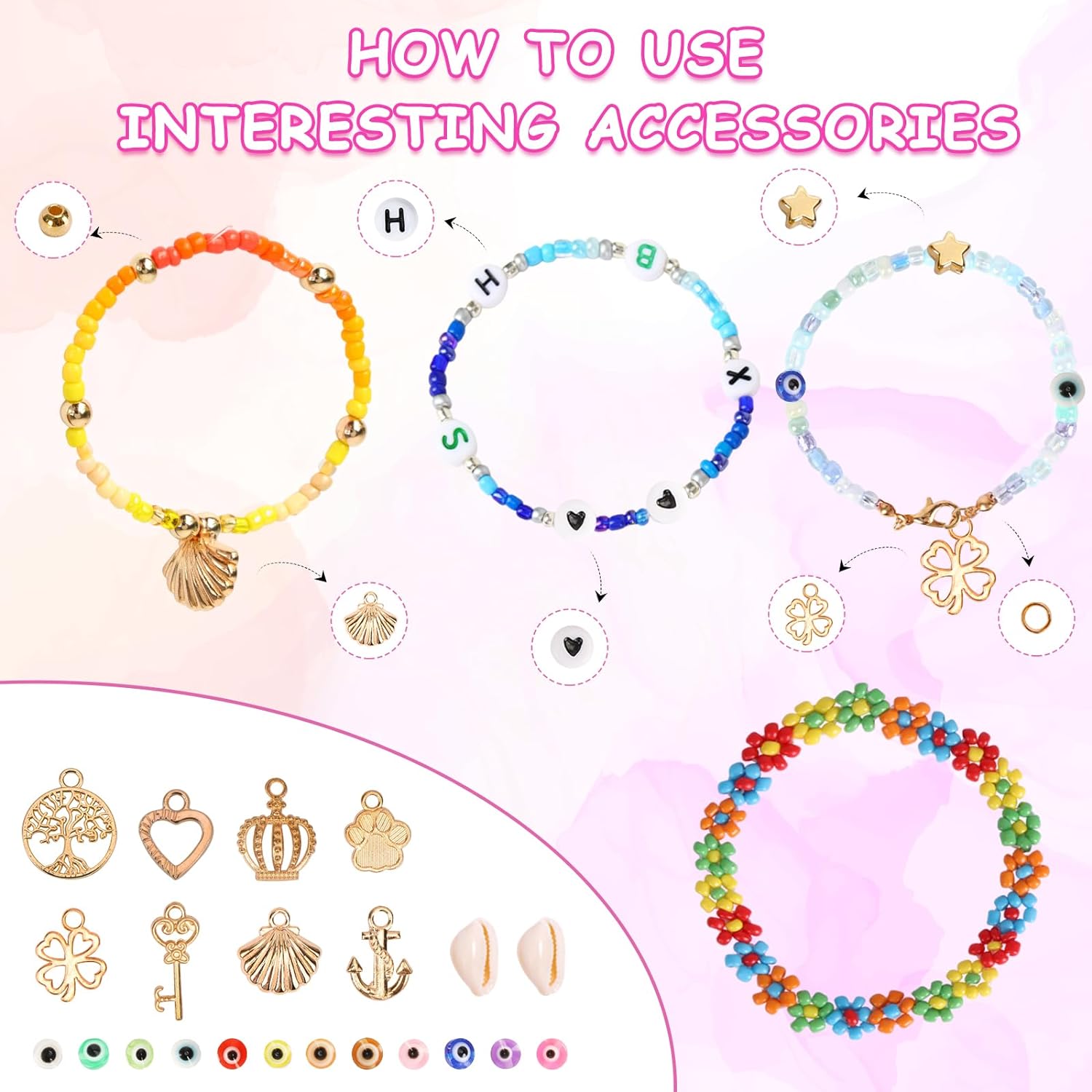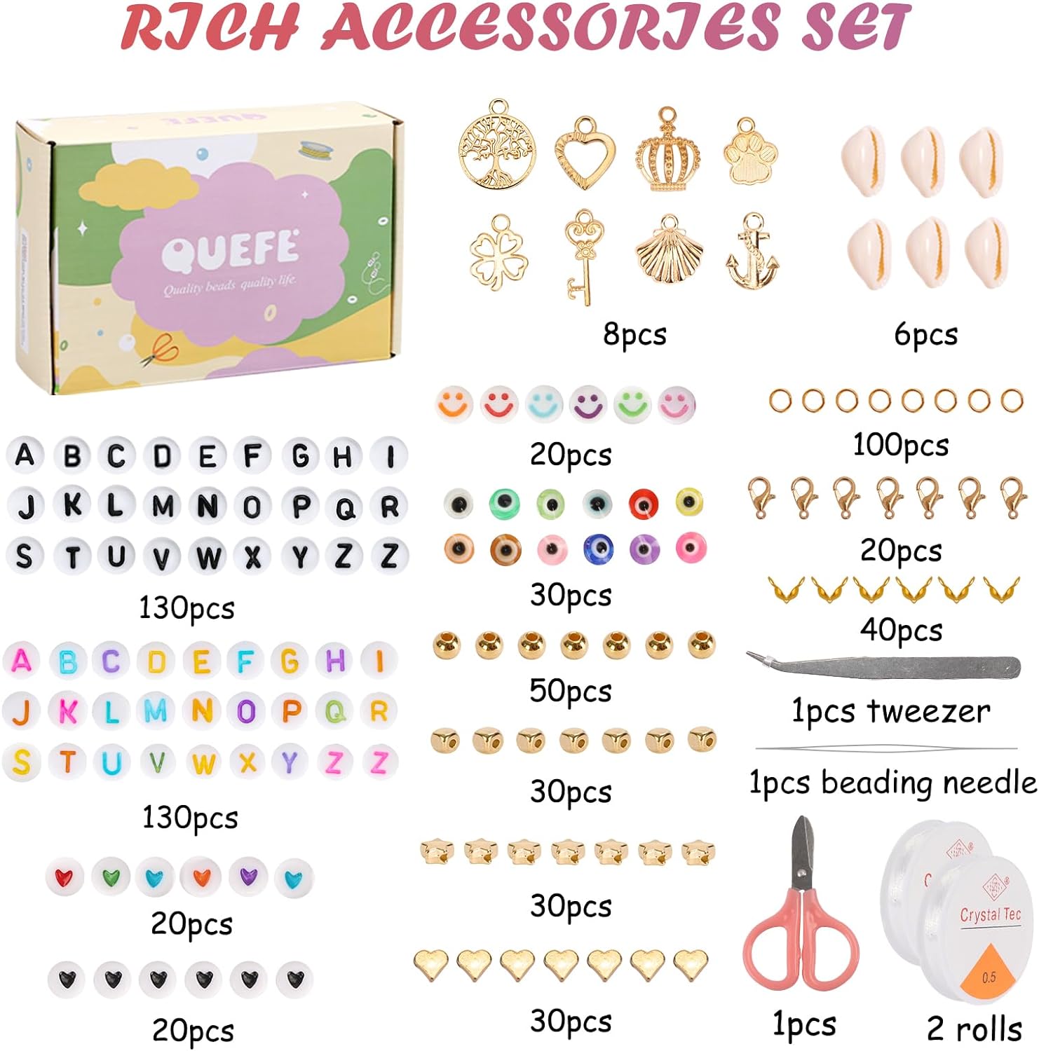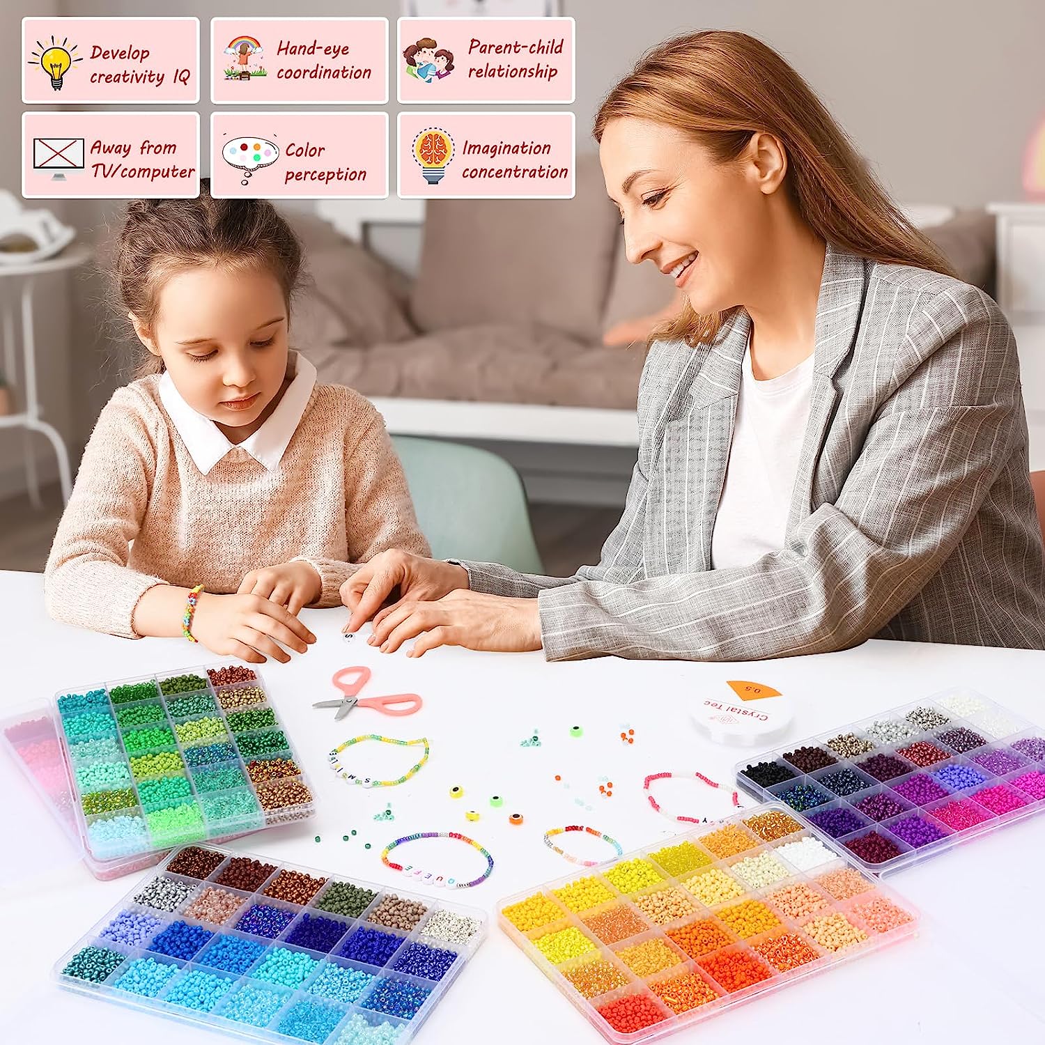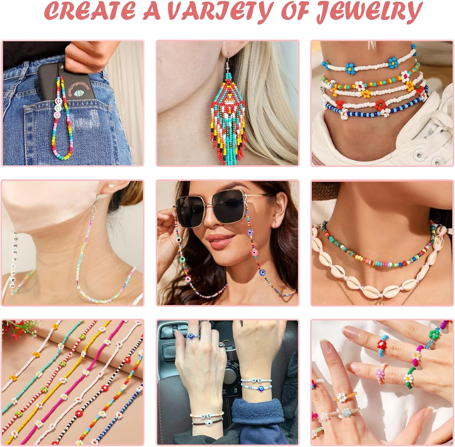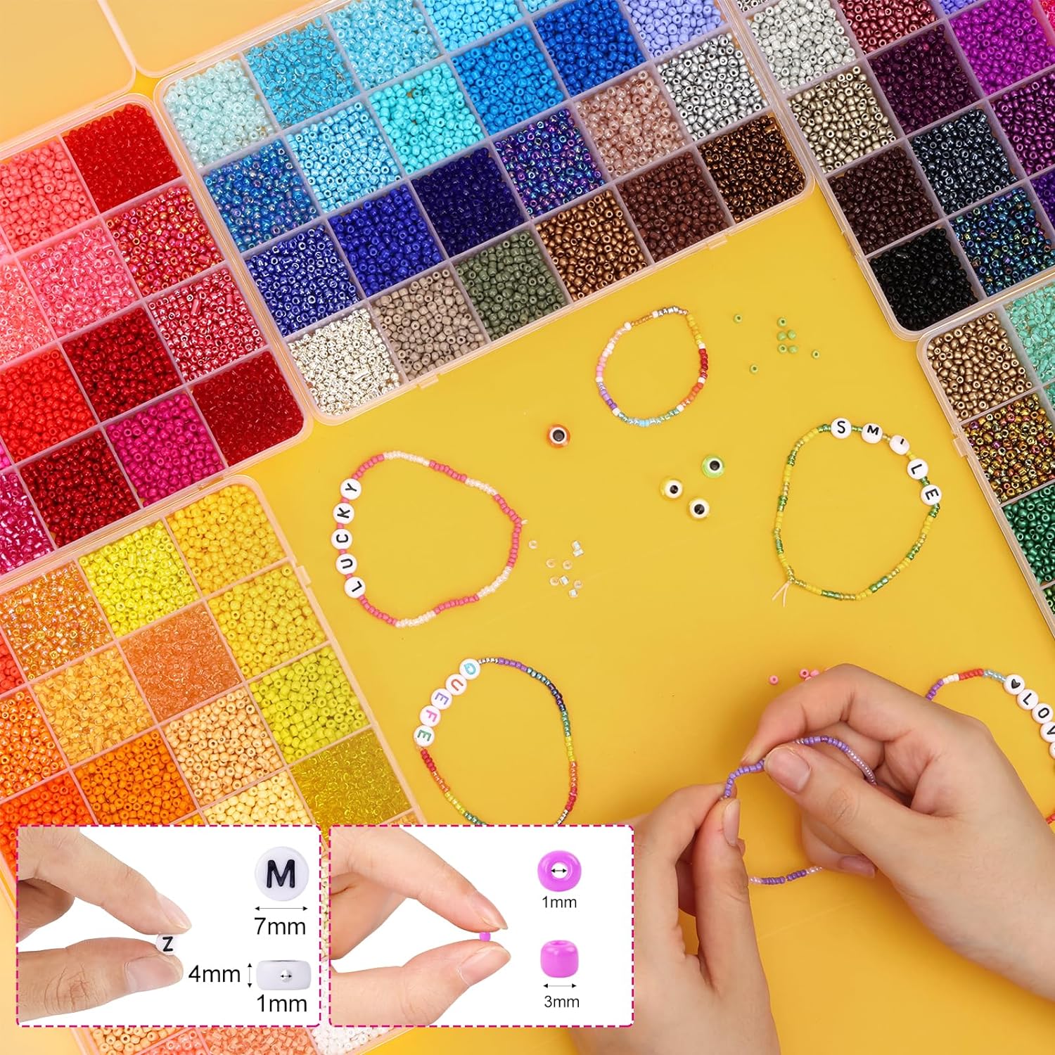 JUEGO DE VALOR: Este juego incluye todo lo que necesita para hacer joyas, incluidas 36000 cuentas de vidrio de 36 mm, cuentas de letras, cuentas de corazón, cuentas de mal de ojo, conchas blancas y accesorios dorados en diferentes estilos. También se incluyen anillas, hebillas, hebillas de langosta, tijeras, pinzas, agujas para enhebrar e hilos de cristal.