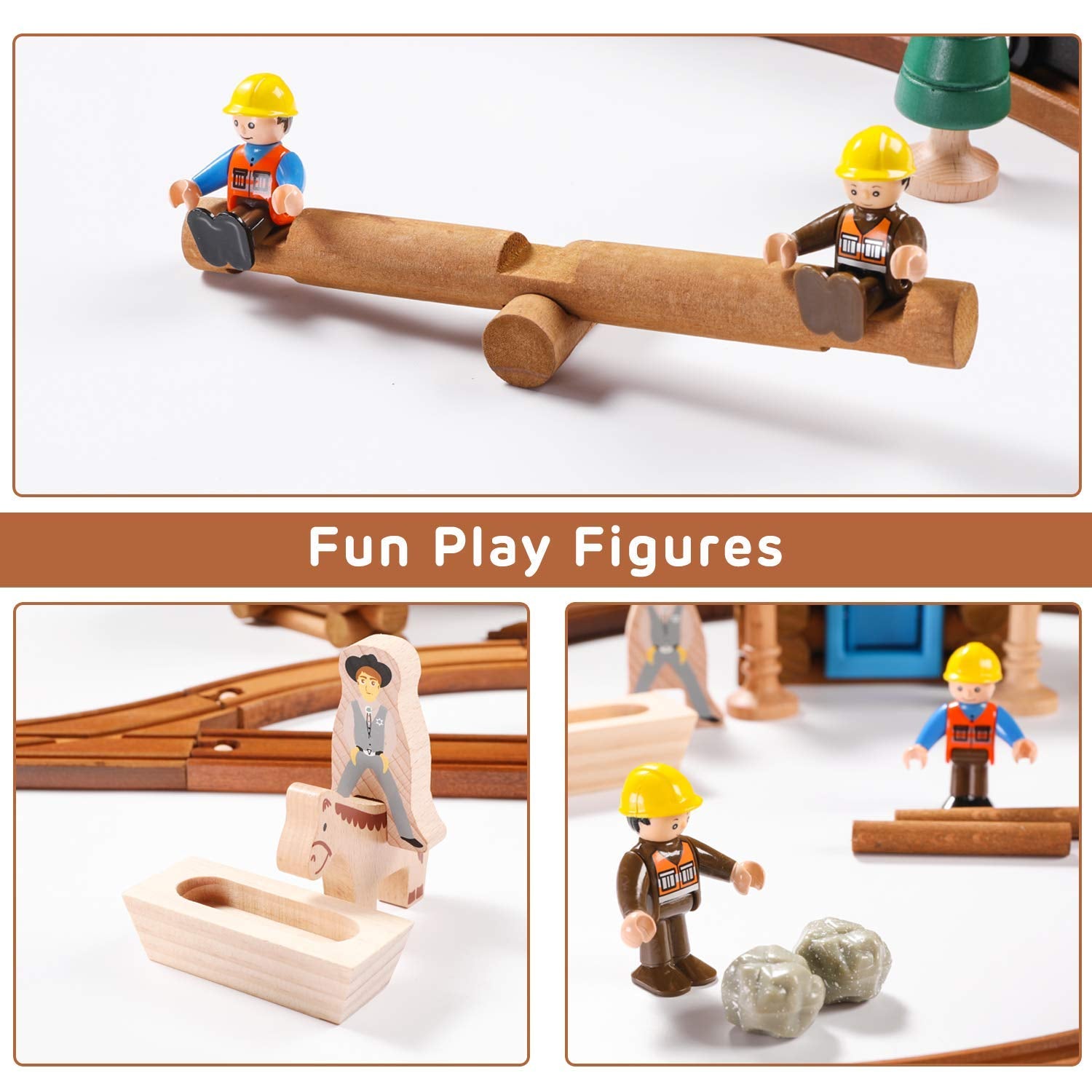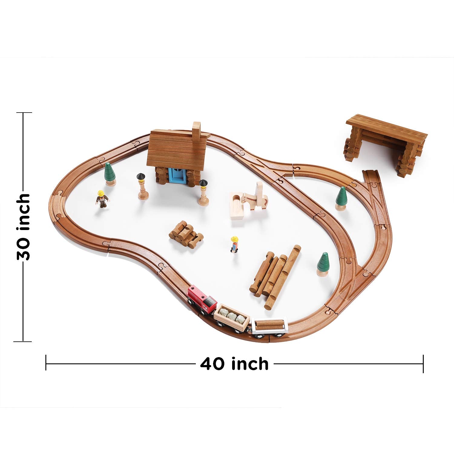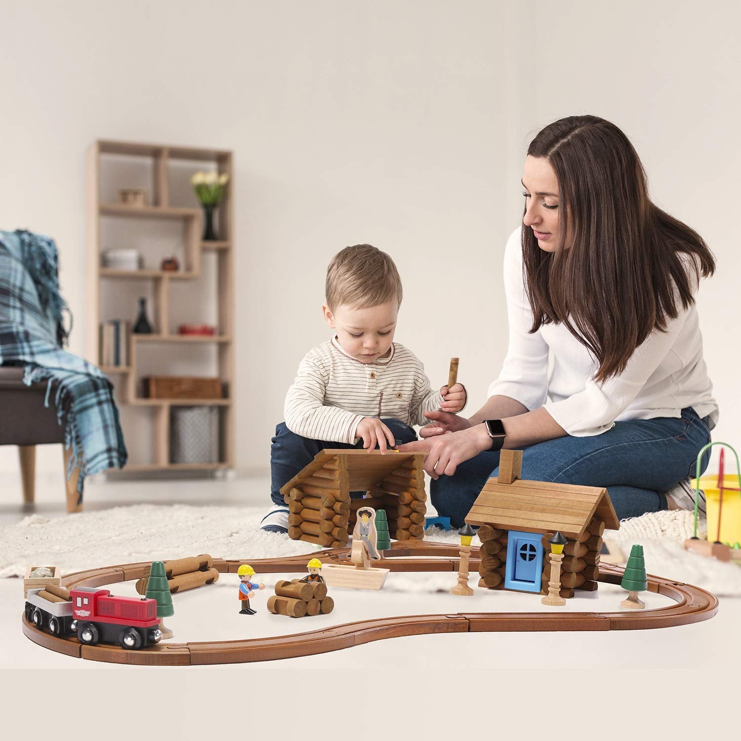 SainSmart Jr. Juego de 100 piezas de tren de madera con cabaña de troncos, pista de tren construible