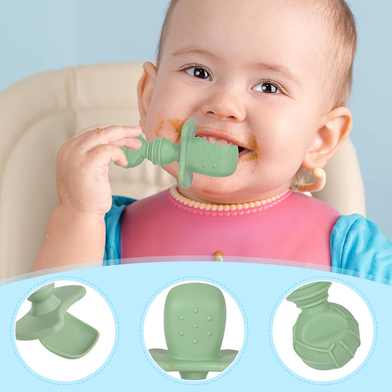 【Material seguro】El juego de entrenamiento para bebés está hecho de silicona 100% apta para alimentos, suave y duradera, no contiene sustancias nocivas, no contiene BPA, es seguro de usar y protege las delicadas encías y dientes de su bebé.