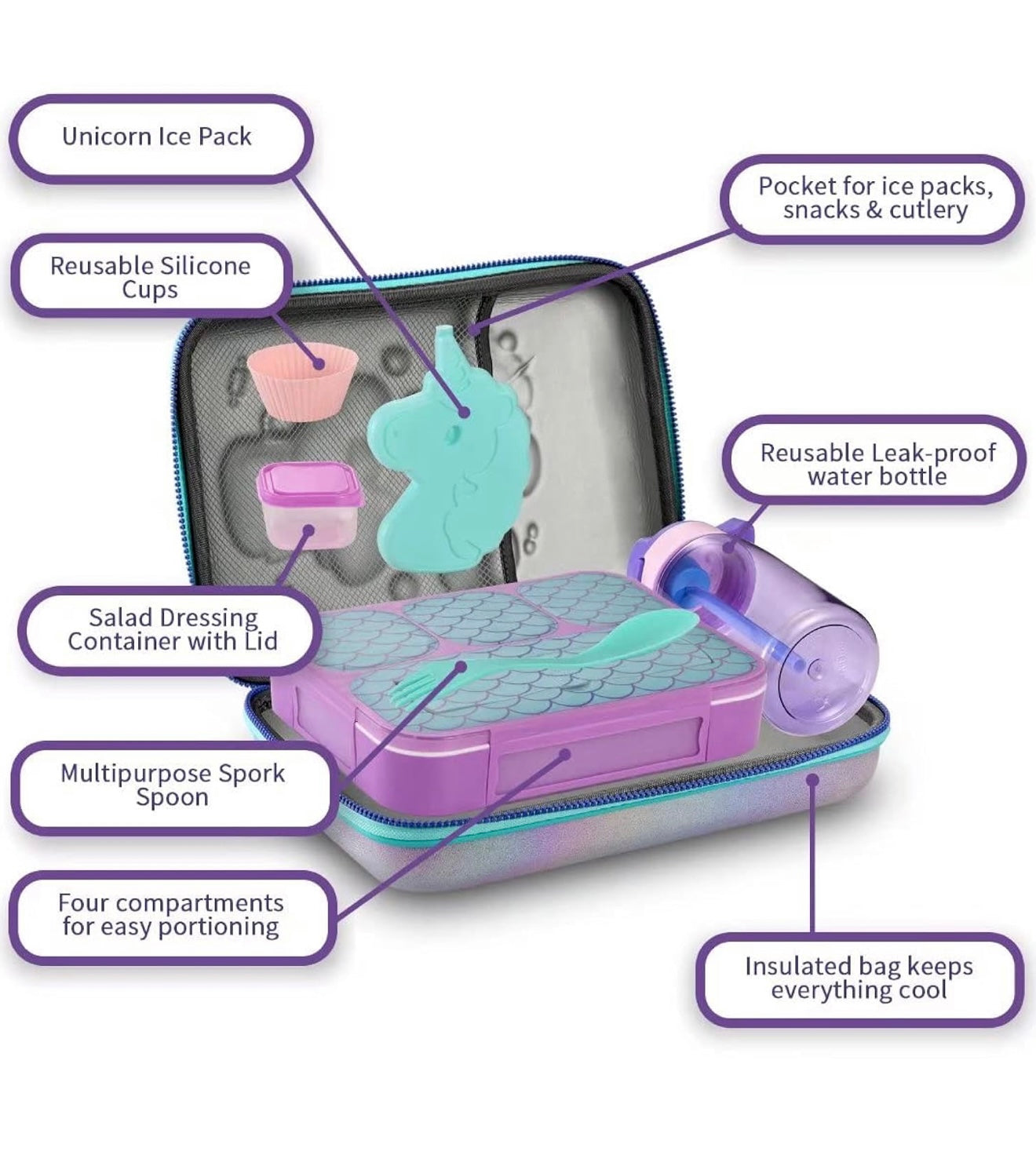 Set de loncheras para niñas: lonchera de unicornio 3D con recipientes