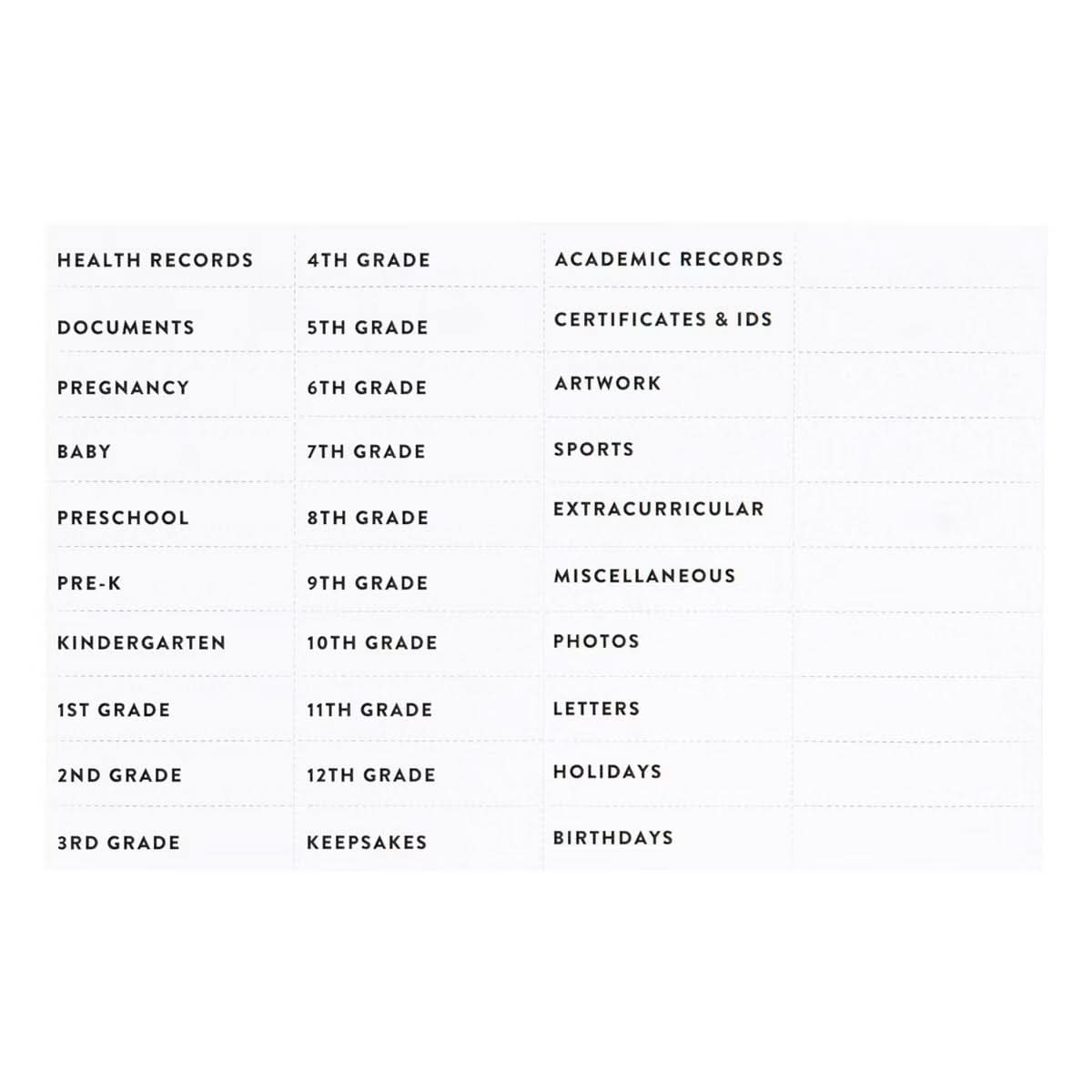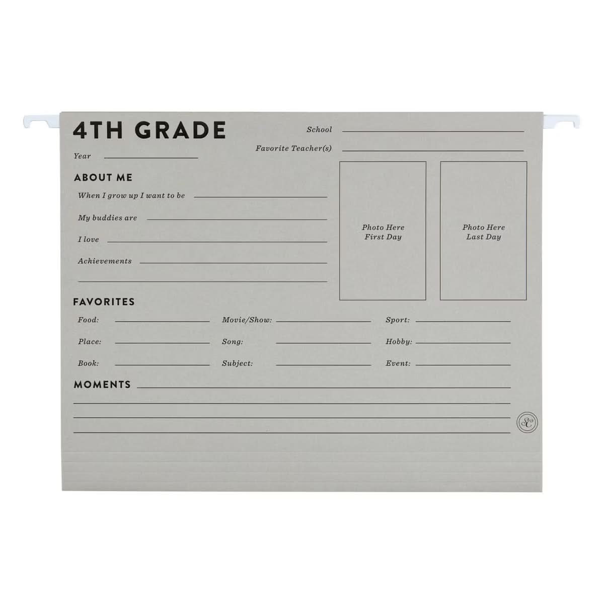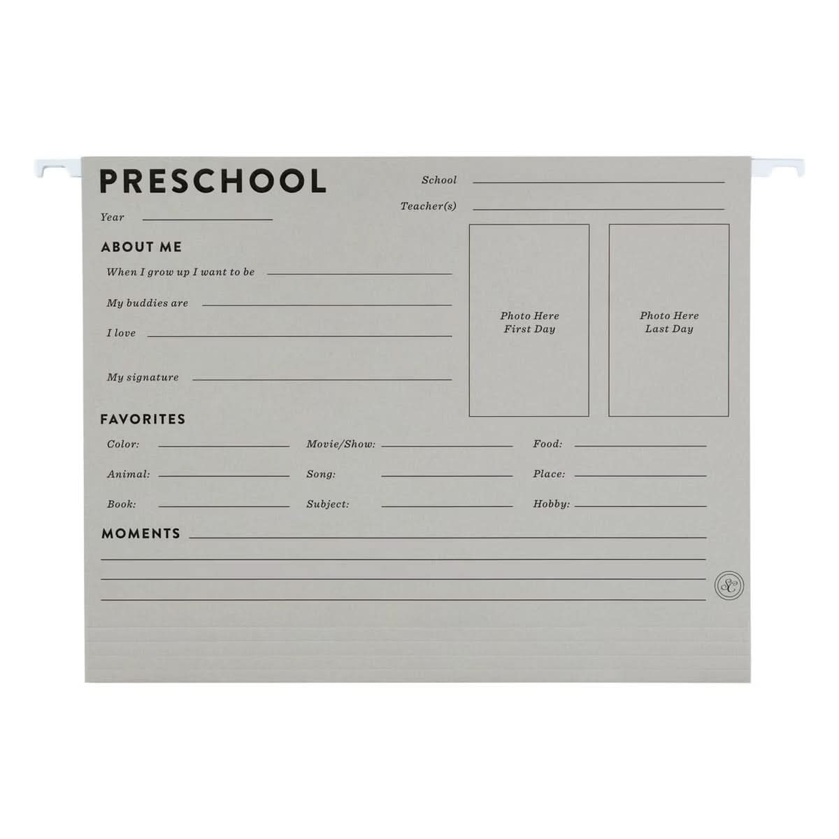14 carpetas colgantes preimpresas para documentar y guardar recuerdos de preescolar, kínder y de 1.º a 12.º grado 6 carpetas colgantes en blanco De preescolar a 3.er grado con el mismo contenido De 4.º a 12.º grado con el mismo contenido La carpeta admite papel estándar de 21,5 x 28 cm Insertos con pestañas preimpresas y en blanco 20 pestañas de plástico Tamaño de la carpeta: 29,5 x 23,4 cm