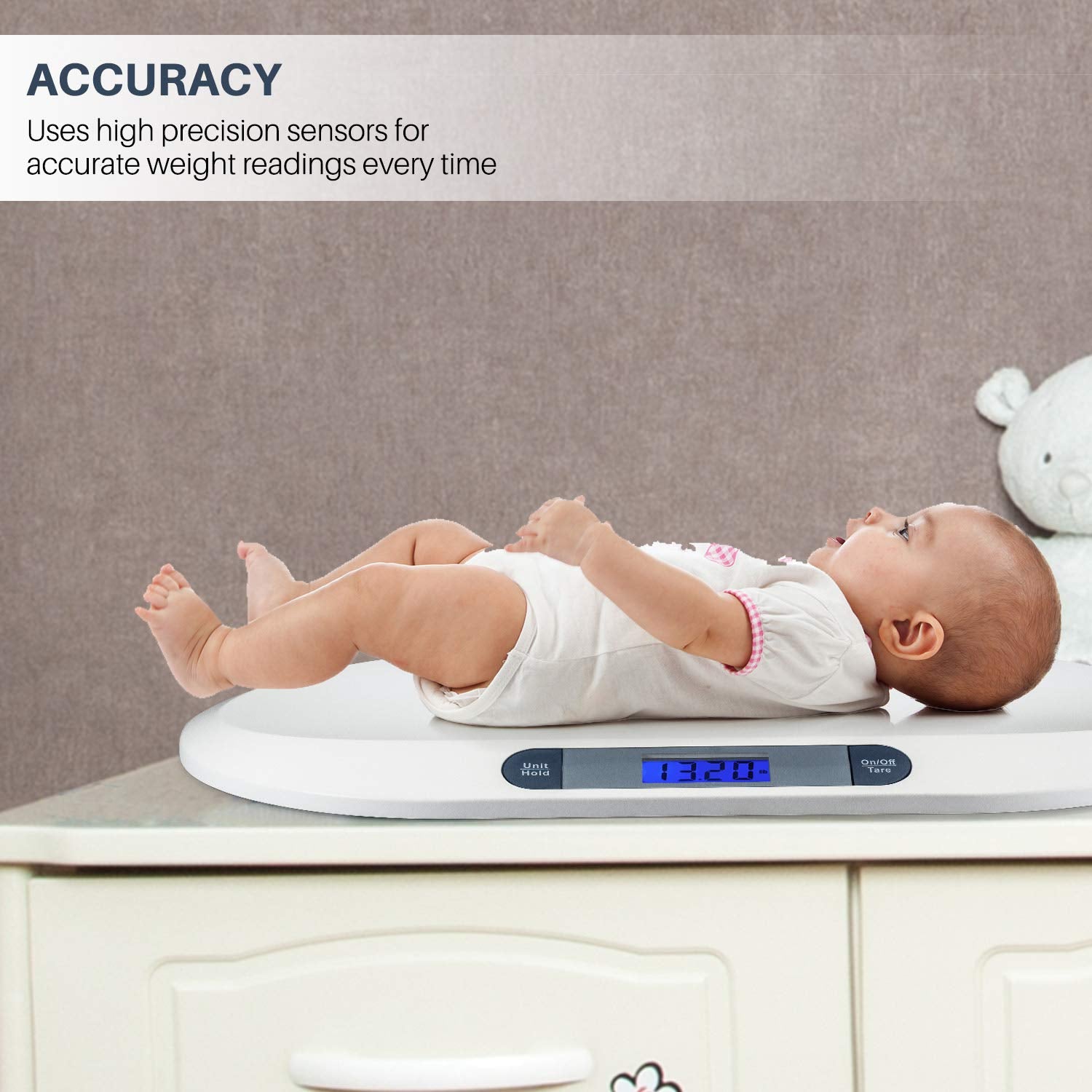 Hecho para bebé: superficie grande y lisa con una plataforma curvada que acuna cómodamente a tu hijo- Lecturas precisas: lecturas precisas en segundos. Se puede mostrar kilogramos (kg) y libras (libras).