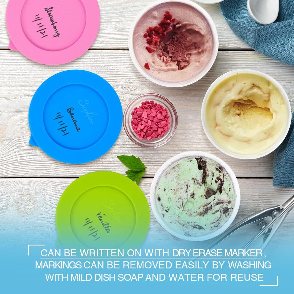 A prueba de fugas y resistente a quemaduras por congelación: nuestras tapas están hechas de 100% silicona de grado alimenticio, que no solo son fáciles de poner y quitar, sino que también son lo suficientemente apretadas para mantener los recipientes de helado sellados, sin más fugas ni derrames. Debido al diseño de la tapa de sellado hermético, las tapas pueden sellar el aire que provoca quemaduras en el congelador, manteniendo el helado, gelato, sorbete u otros alimentos congelados lo más frescos posible.