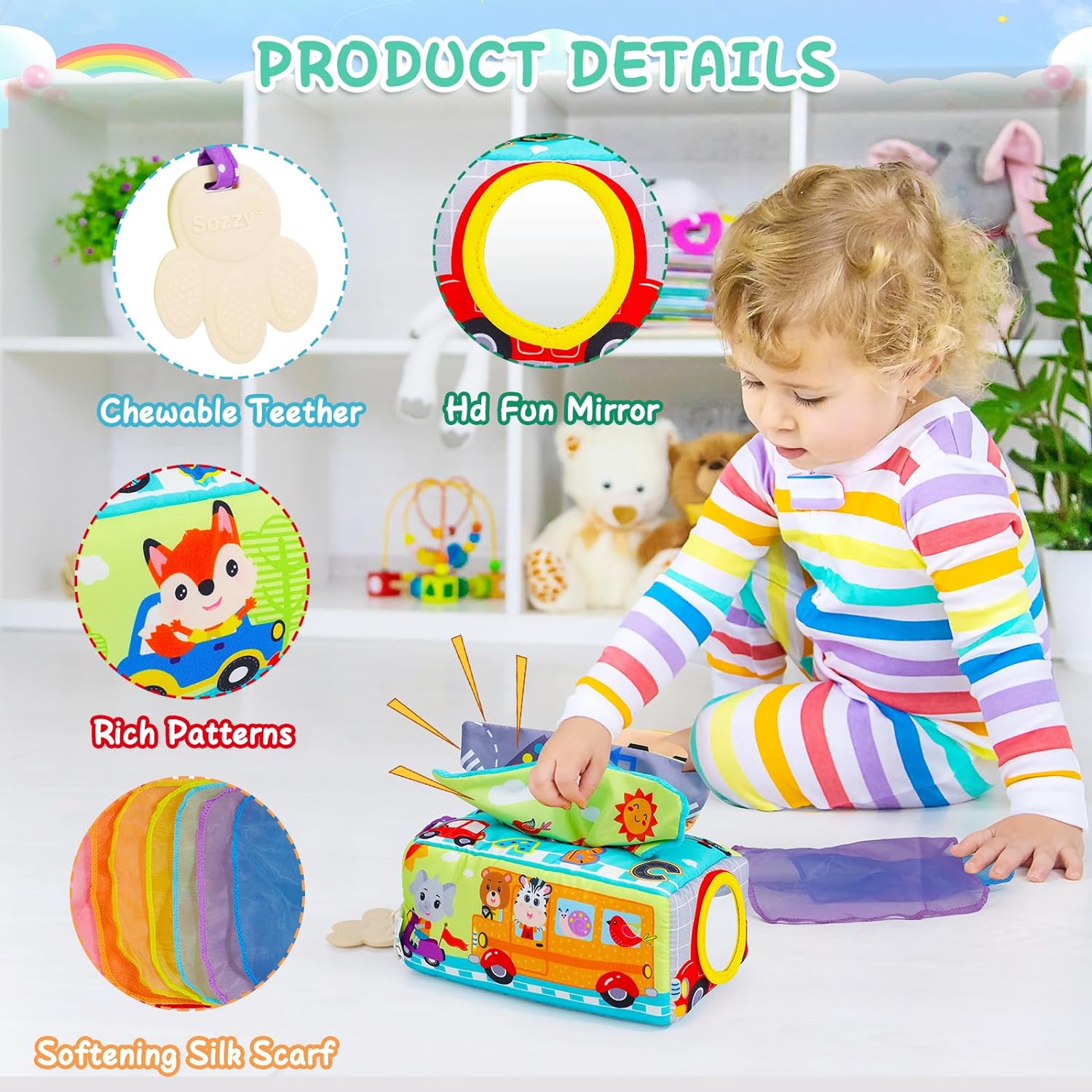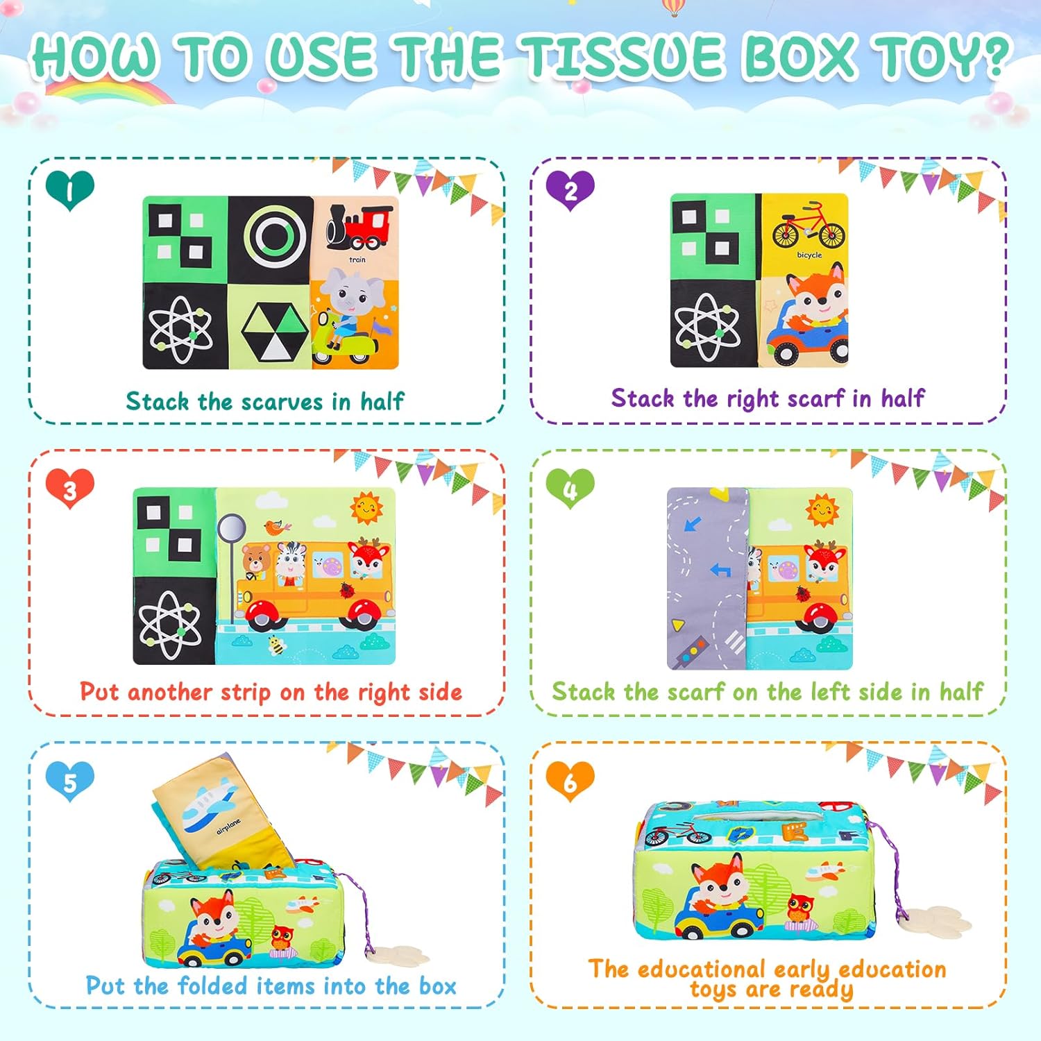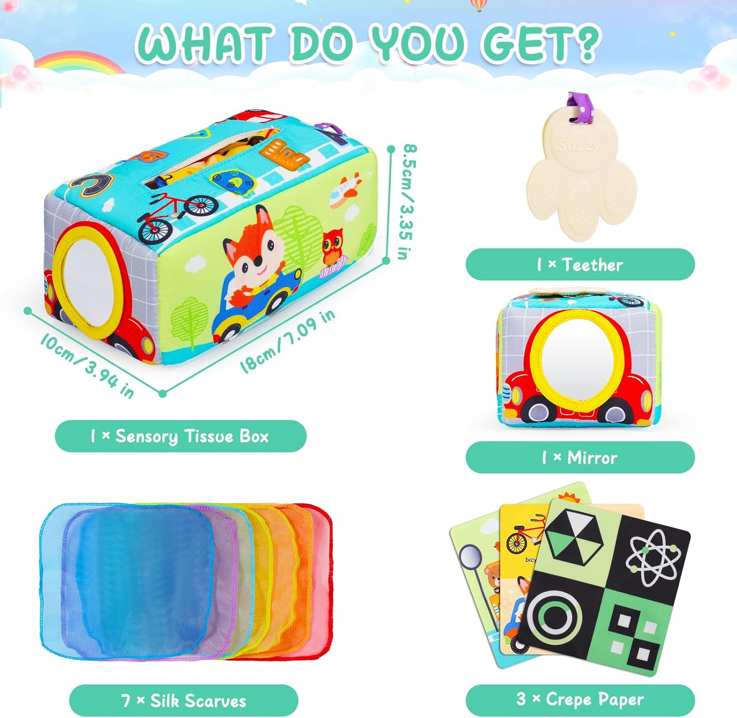 【Juguete multifuncional】 Este juguete sensorial de caja de pañuelos para bebés es adecuado para bebés de 6 a 12 meses y está diseñado para involucrar a bebés y niños pequeños de una manera divertida y emocionante, ayudando a los bebés a desarrollar su desarrollo físico y cognitivo.