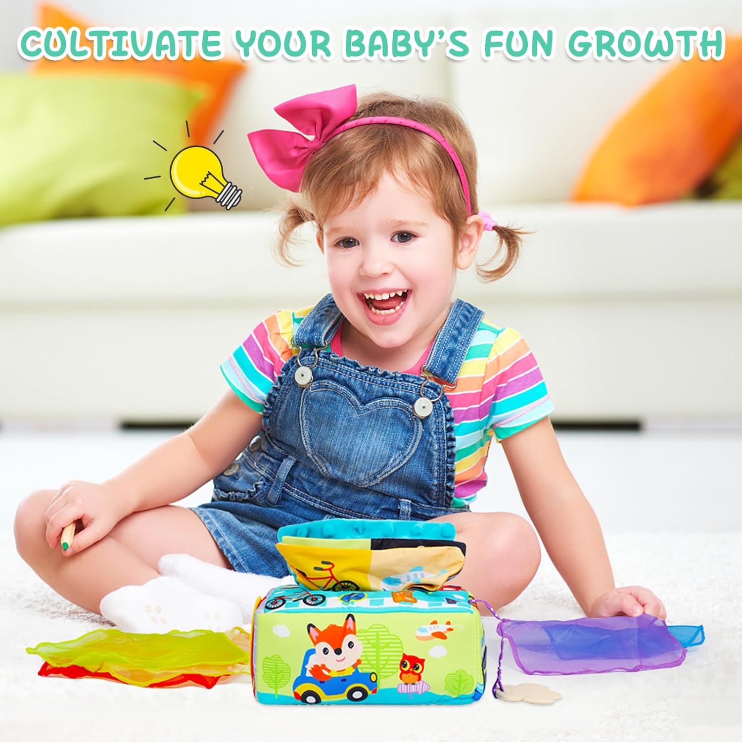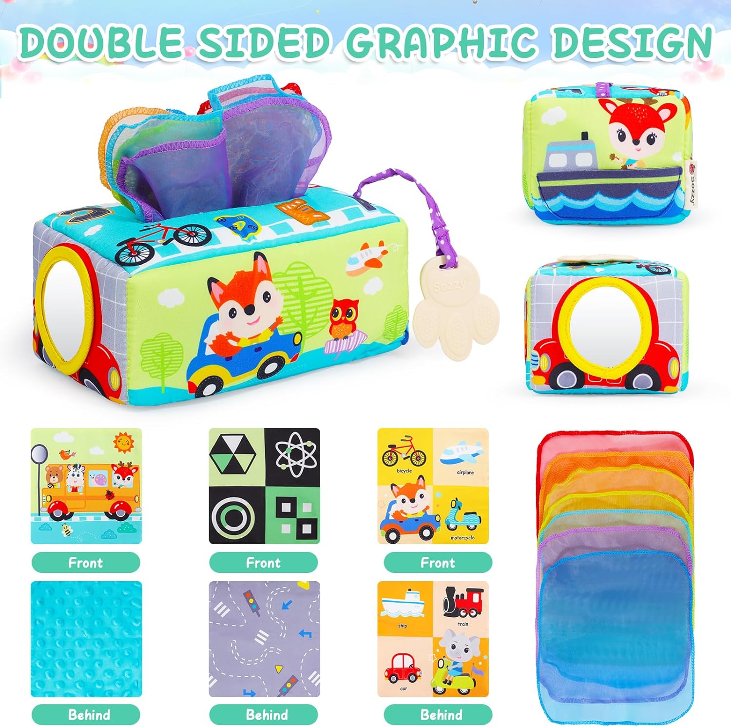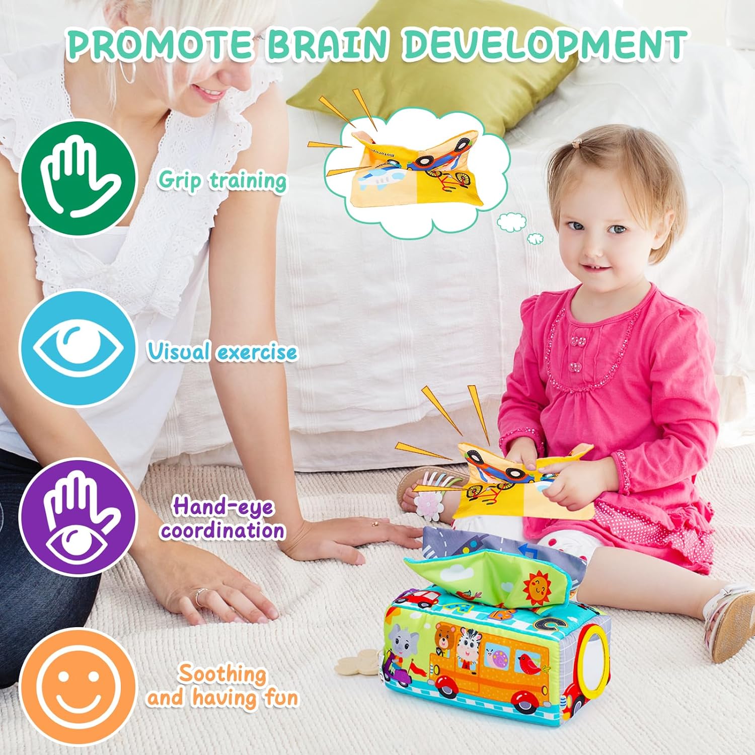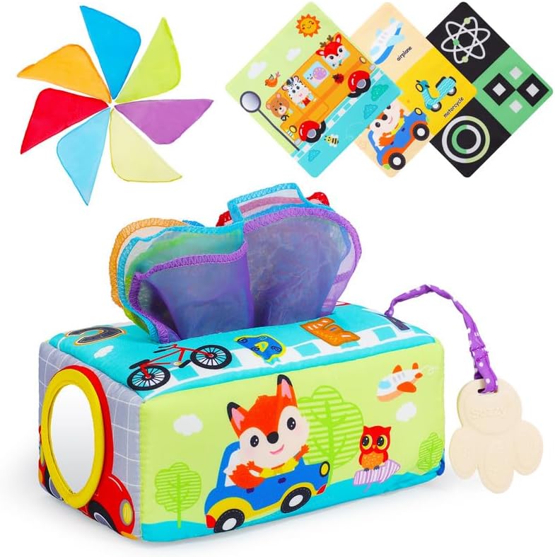 【Juguete multifuncional】 Este juguete sensorial de caja de pañuelos para bebés es adecuado para bebés de 6 a 12 meses y está diseñado para involucrar a bebés y niños pequeños de una manera divertida y emocionante, ayudando a los bebés a desarrollar su desarrollo físico y cognitivo.