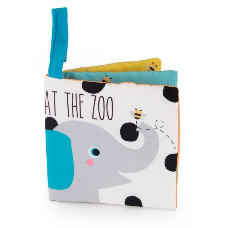 *Caja con detalles*. Un libro suave y arrugado para bebé que muestra diferentes animales del zoológico en cada página. Un mordedor con sonajero de elefante a juego es ideal para la dentición y el descubrimiento.