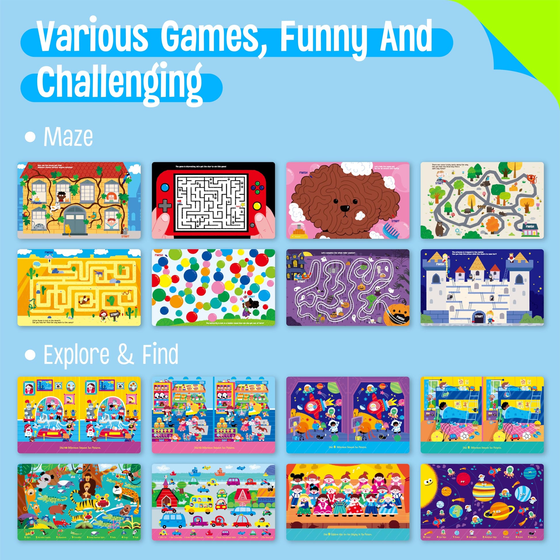 - Diseño único: los libros de actividades cuentan con un diseño distintivo con varias y adorables imágenes en colores vibrantes. Los diseños creativos, brillantes y coloridos seguramente serán amados por los niños, lo que puede capturar en gran medida el interés de los niños, centrar su atención y despertar su imaginación. Con estos libros de juegos, los niños pueden mejorar su coordinación ojo-mano, concentración y habilidades de pensamiento lógico participando en diferentes juegos.